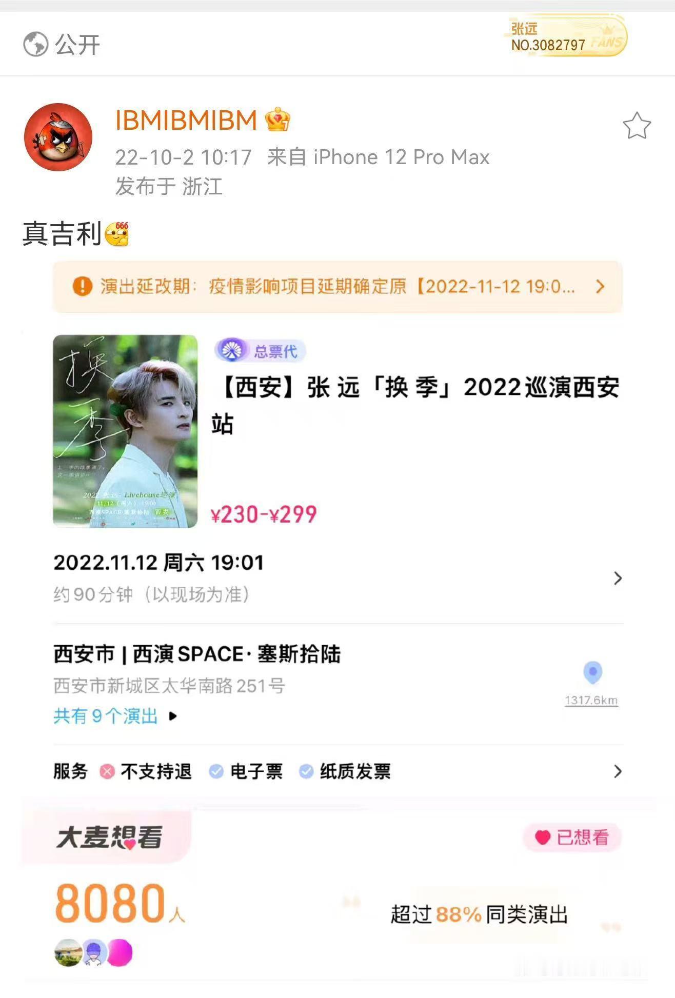 Bird 远行巡回演唱会西安首站开票秒售罄,开票前想看人数一路飙升至 10w,售罄后平台直接下架,人气爆棚!从一巡换季西安场 8000 想看人数,到现在的 10w 预约,从 livehouse 走到体育馆,再从体育馆连开走到体育场连开,张远脚踏实地稳步走,这都是他应得的!张远西安演唱会售罄