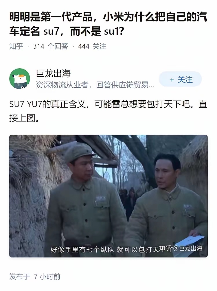 一个很有意思的问题,明明是第一代产品,小米为什么把自己的汽车定名SU7,而不是SU1?真是没想到距离小米第一台车发布,已经过去快两年了,还能看到这个问题。雷军在微博里提到过命名问题,小米要做极致速度,Speed Ultra缩写就是“SU”;为了方便好记因此就叫“SU7”,至于为什么不叫“SU1”,最合理的解释是7指的是大小,就是5米车长、3米轴长的C级车不止是小米,不少新势力汽车品牌在产品命名上也参考了宝马和奥迪的做法,例如蔚来ET5和蔚来ET7,那蔚来ET7是比较高端的车型,小鹏P5、小鹏P7也是如此,小鹏P7也是比较高端的车型其实在汽车市场,不少厂商采用1、3、5、7来对车型进行大小的区分,例如宝马1系、3系、5系和7系。宝马7系也不是说这个系列的车型有7米长,只是说明车很豪华,同时也比较大