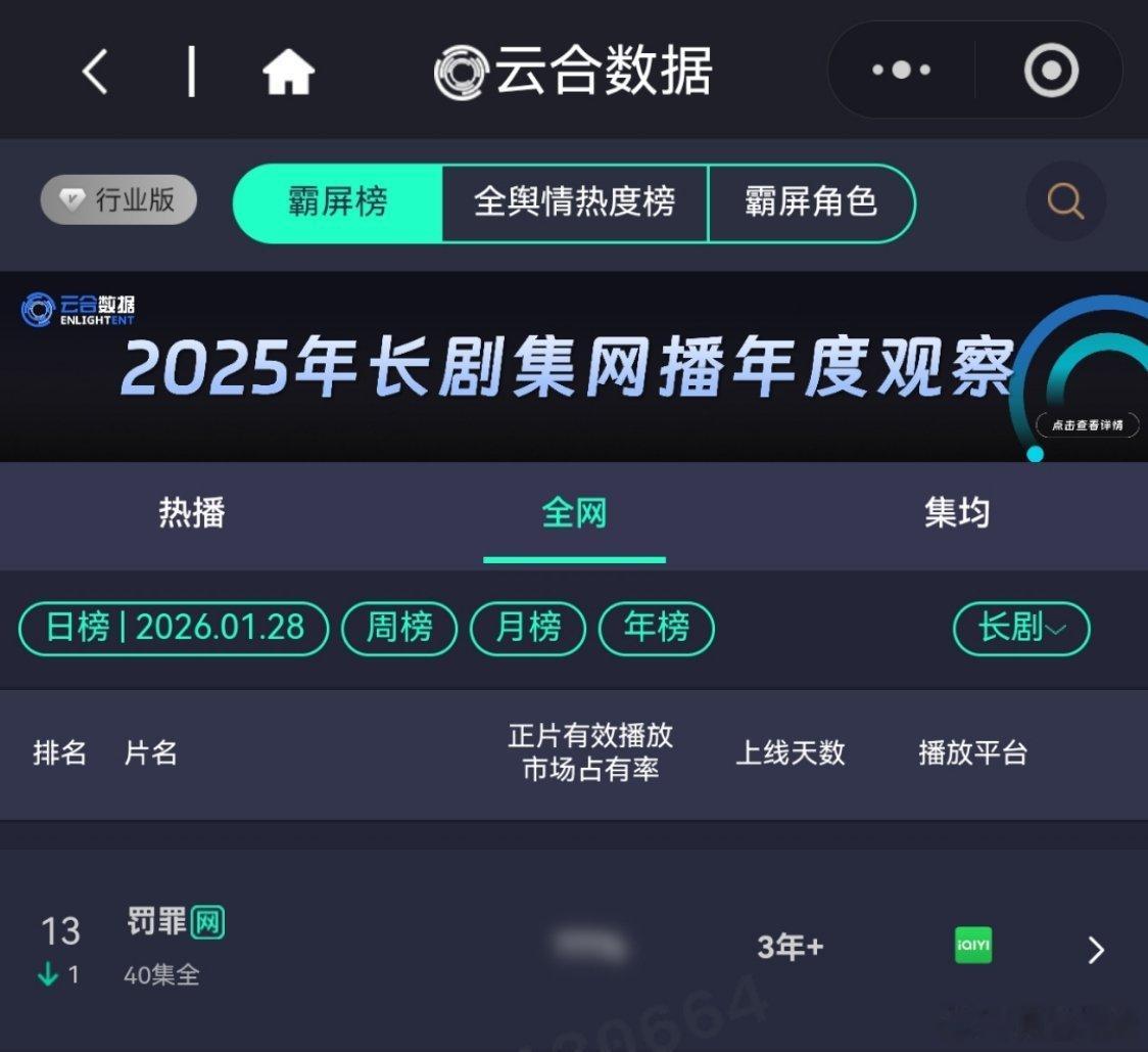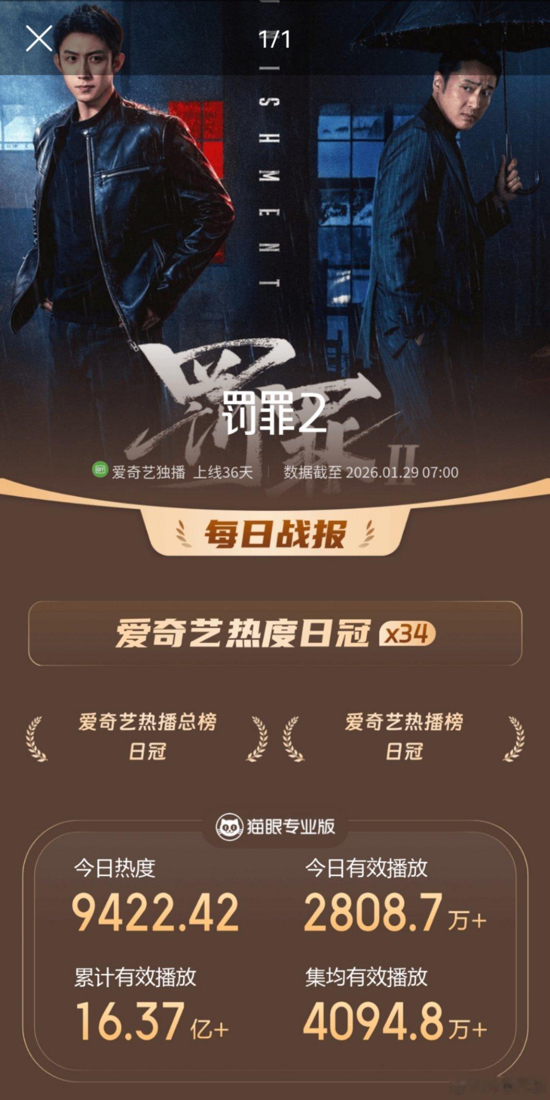 1月28日,罚罪2VIP更新结束第11天,继续保持第3名,爱奇艺热度、热播总榜34冠。罚罪,云合第13,《冬至》云合网剧第27,酷云卫视收视率,《冬至》第3(新高),《雪迷宫》第9,今天两个剧都将迎来大结局。黄景瑜罚罪2黄景瑜秦枫 。