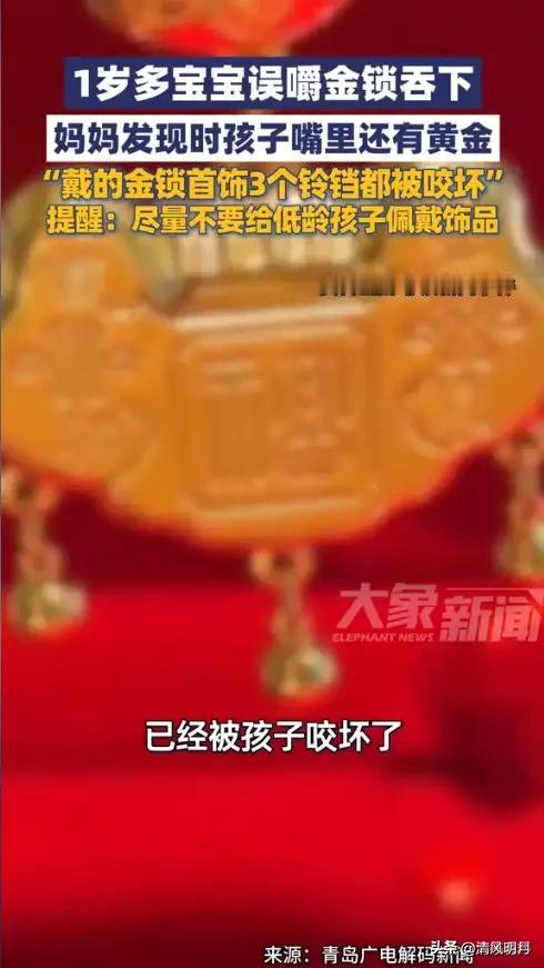 这位小孩太危险了! 近日,贵州贵阳,一女子睡觉前突然听见1岁多的宝宝嘴里在咬什么东西,开灯一看孩子嘴里竟然有黄金,而挂在脖子上的金锁竟不见了,上面3个铃铛已被全部咬坏,吓得她赶紧带孩子就医检查。 医生检查后告诉她:金锁机已经进入肠道内! 这起事件令人十分揪心,也提醒家长在日常生活中要格外注意儿童的安全。 这类事件反映出幼儿在探索世界时的好奇心极强,但同时也伴随着潜在的危险。 金属饰品、细小物件等都可能成为儿童误吞的风险,甚至引发严重的健康问题。家长应加强对孩子的看护,避免让他们接触到可能吞咽的危险物品。 医生建议,一旦发现儿童误吞异物,应立即就医,避免异物卡住或引发感染。 家长也应选择安全、适合儿童佩戴的饰品,避免挂有易咬坏或易脱落的装饰物,确保孩子在探索世界时的安全。 这起事件再次提醒我们,儿童的安全无小事,家庭和社会都应共同努力,为孩子营造一个安全、健康的成长环境。