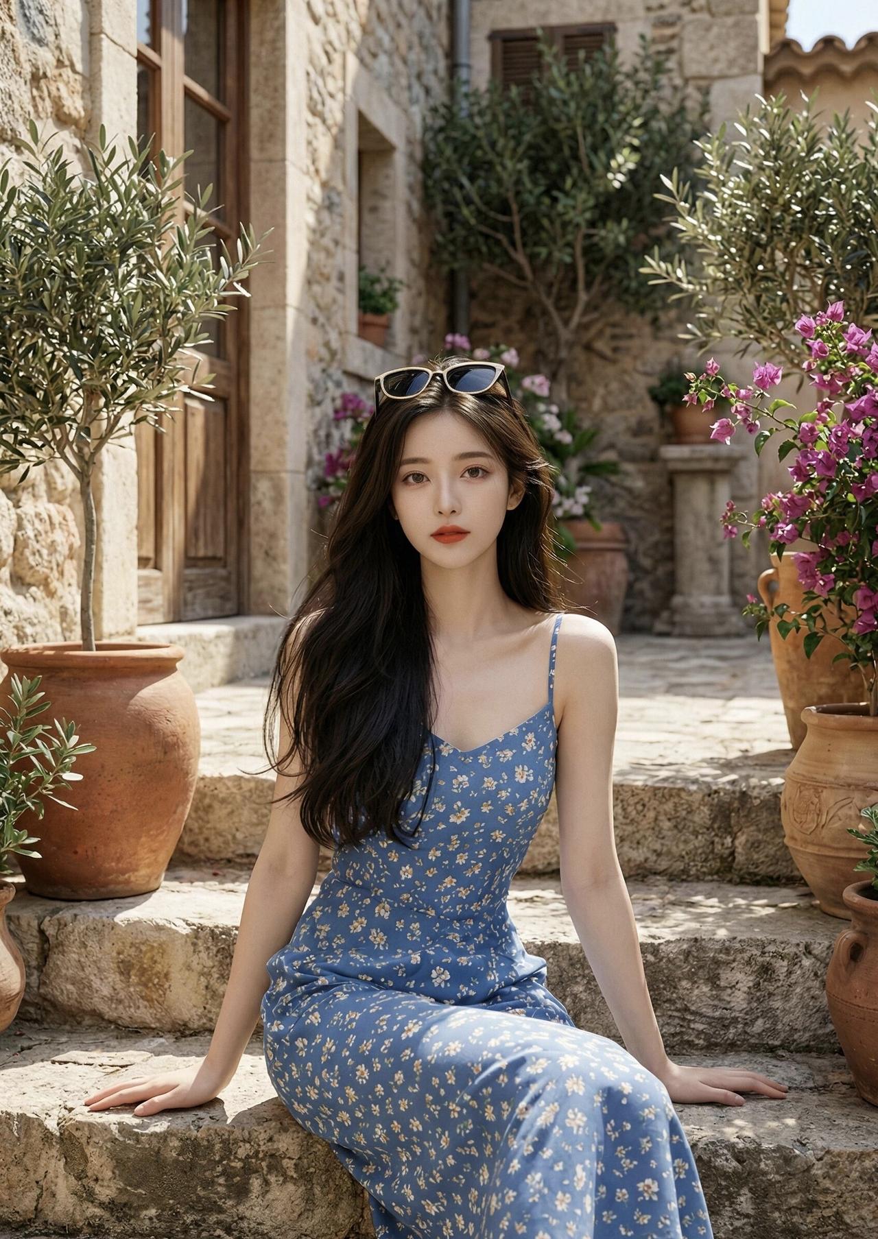 阳光下的优雅时光,蓝花裙与石阶的完美搭配。