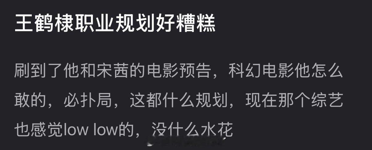 有网友说王鹤棣职业规划好糟糕,和宋茜的电影预告是必扑局,现在的综艺也low lo