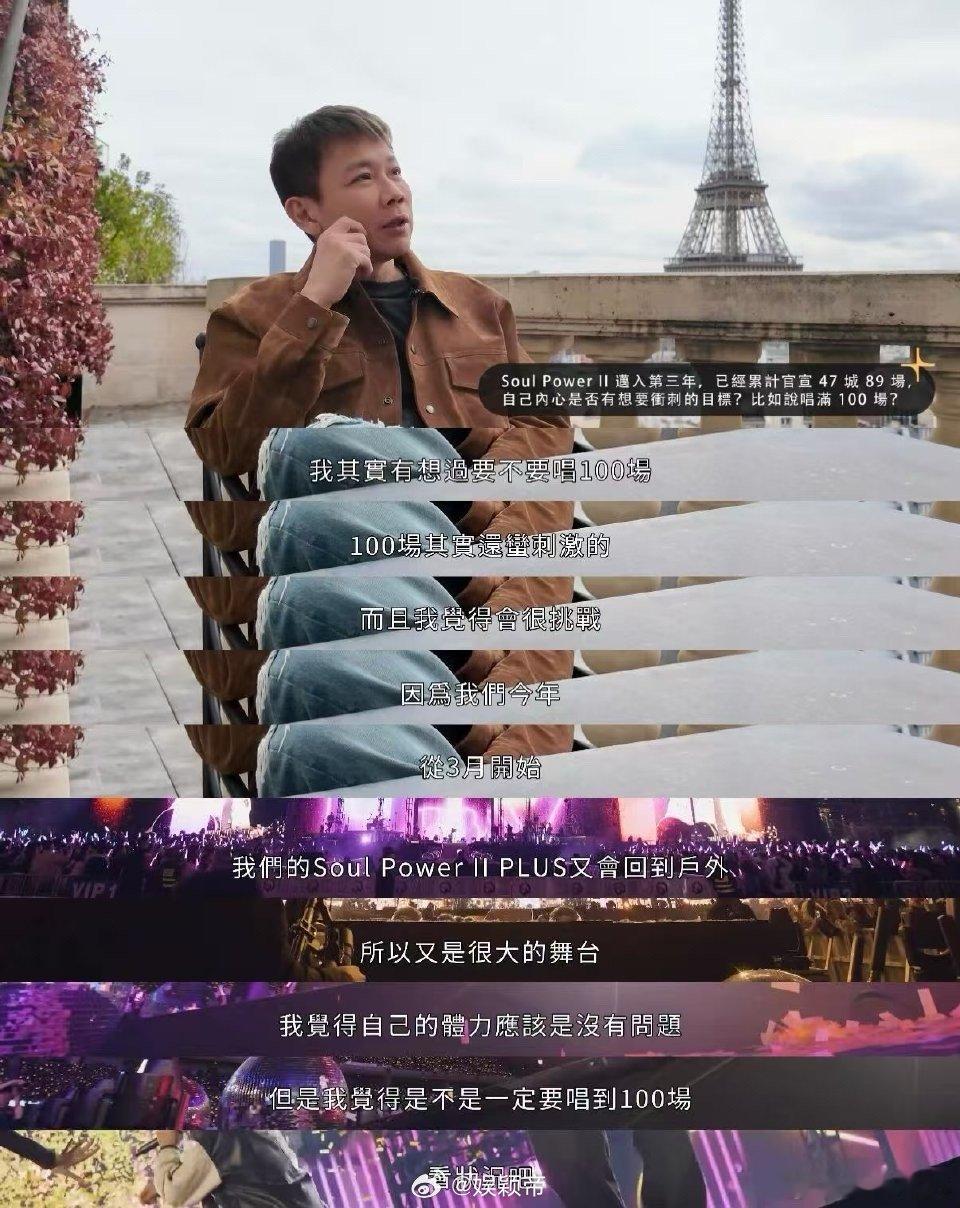 陶喆计划冲刺巡演100场 不愧是乐坛常青树陶喆!对于“冲刺100场巡演”的设想,他自信回应体力不是问题,看状况有机会达成。巡演现已官宣至第89场,这份成绩单和大哥依然在线的状态,让百场梦想显得触手可及!