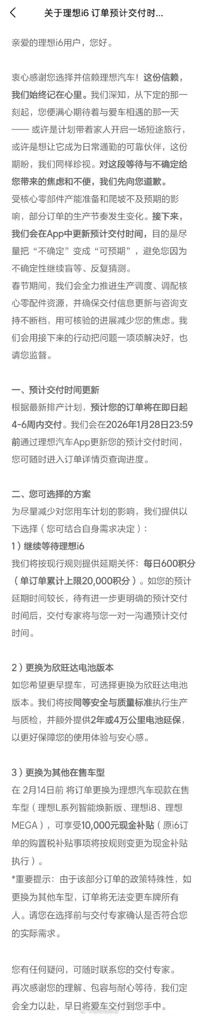 理想 i6 交付又延期了。为降低用户等待焦虑,理想汽车提出三项方案供用户选择。-按现行规则提供延期关怀积分。-跟换欣旺达电池的版本,并额外提供 2 年或 4 万公里电池延保。-在 2 月 14 日前更换为理想 L 系列智能焕新版、i8 或 MEGA 车型,可享受 10,000 元现金补贴,此前享有的购置税补贴将按规则转为现金补贴。理想 i6308_IO新能源汽车