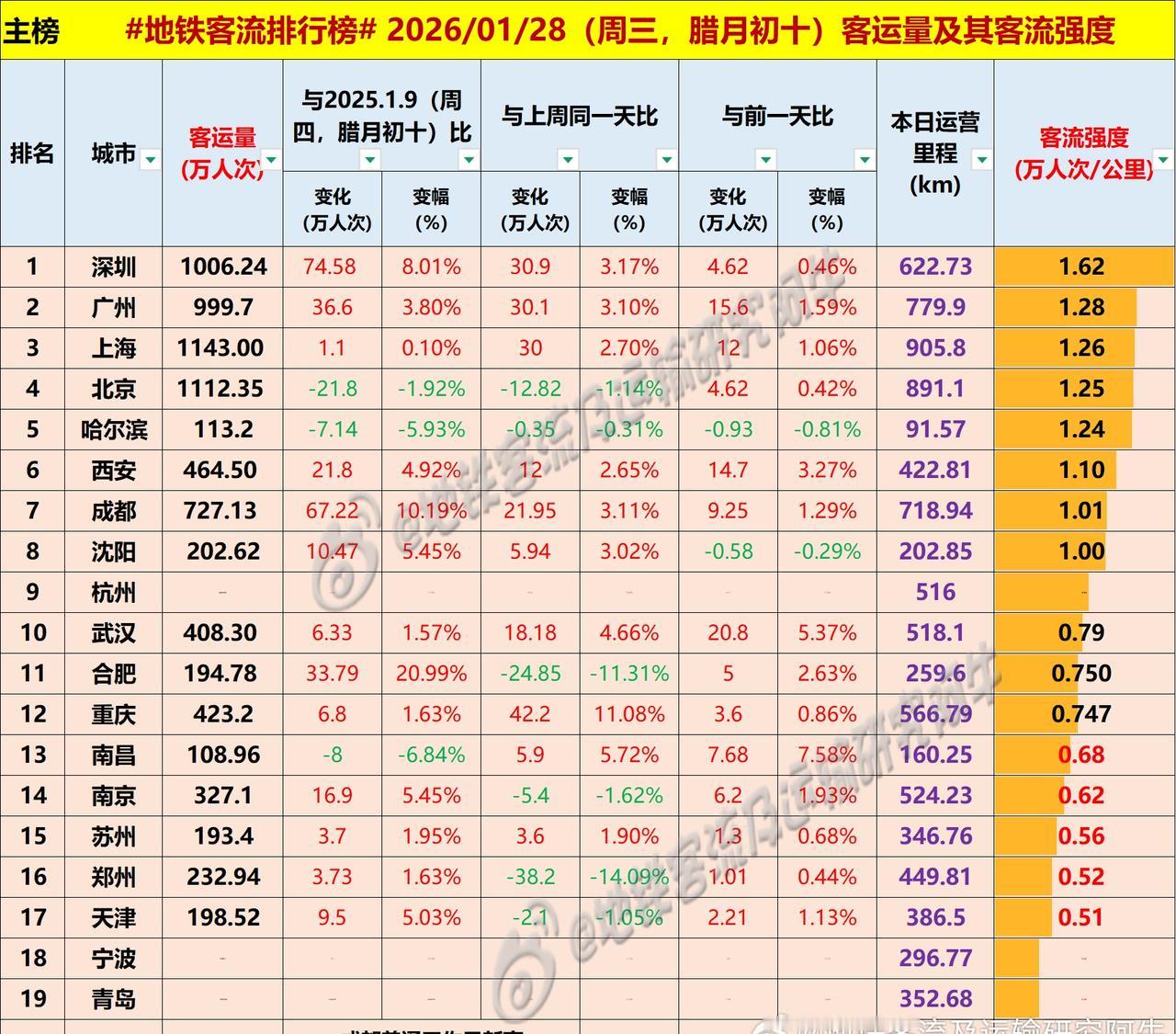 【中国城市地铁客流排行榜 2026-01-28(周三,农历腊月初十,中国地铁客流日报】 主榜风云:19+1城争霸,沪深双榜! ——昨天上海与北京都破了1100万,上海直逼1150,深圳本周连续三天破千万,以前在这个季节从来没有过,放在一年前要是说这种普通工作日破千万简直不敢相信,但现在真的发生了;广州昨日999.7万,差一口气破千万,其实也是进步很大,只是因为大学放假了,最近不及过往佳境。成都最近连续几个普通工作日都站稳700万,昨日更是普通工作日新高,不想赞美,但她表现真的很好,老铁们回顾2020年五线齐发,2021年开挂,再看今年,预计必有一番令人惊叹的作为!……(此处省略三千字)