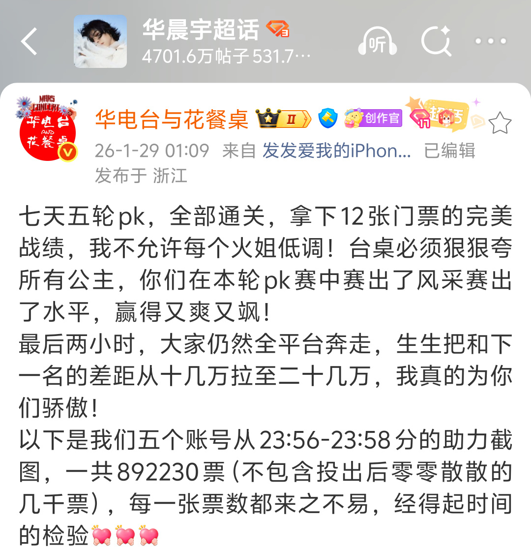 华晨宇这种敢放最后助力截图的纯手搓太厉害了吧,这次微博之夜pk两个号赢了12张票,总榜共拿了29张,排位歌手断层第一,不愧是老牌顶流