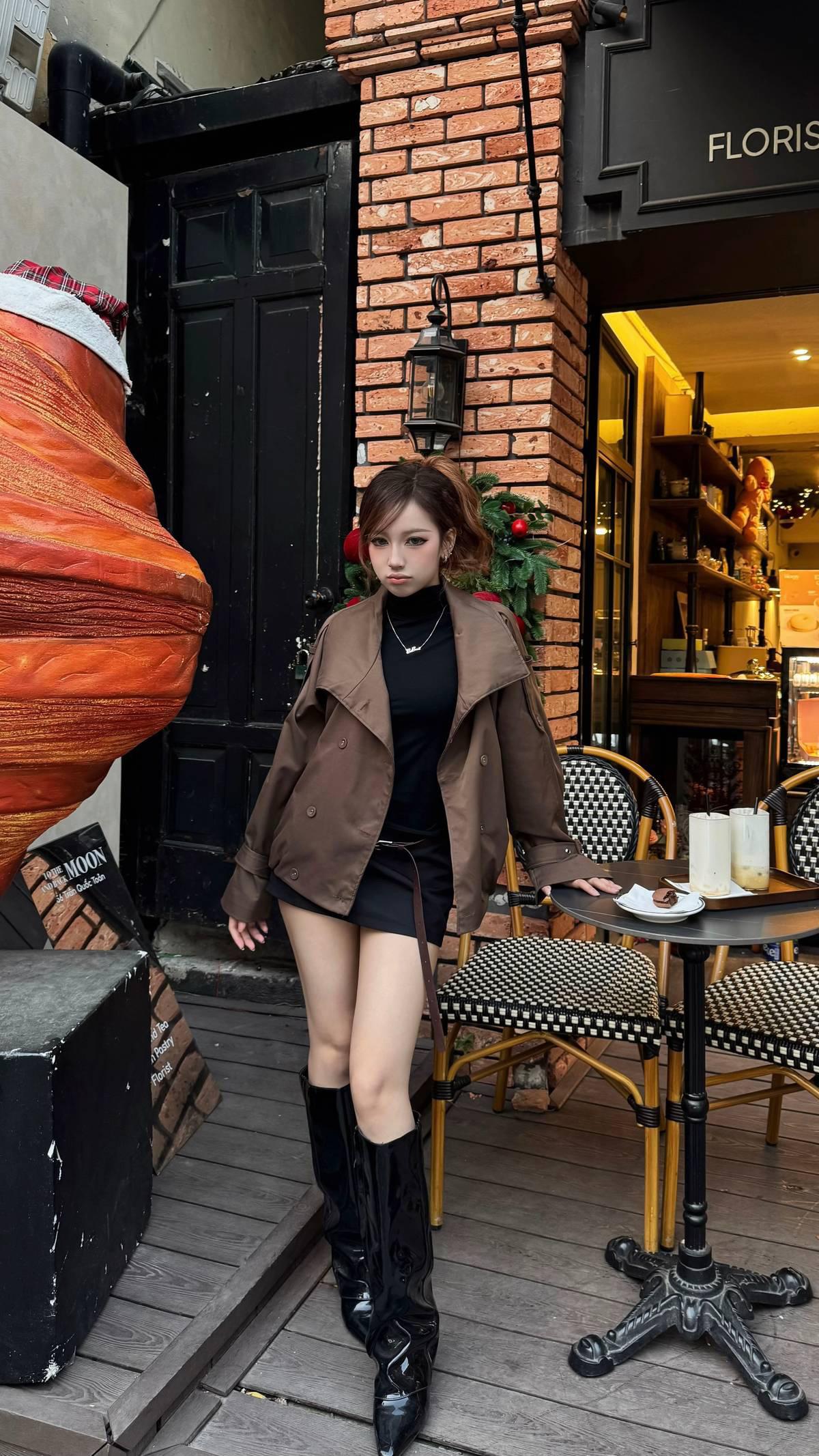 浅灰色毛衣搭配白色短裙+长靴子棕色短裙穿搭 灰色修身裙穿搭 灰色裙子穿搭 灰色时