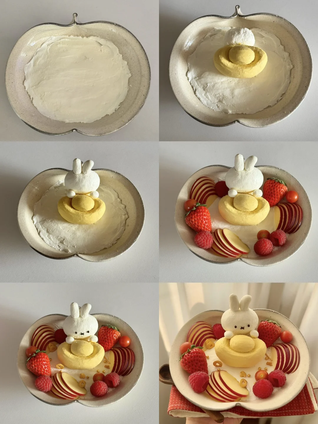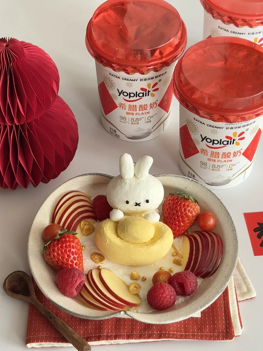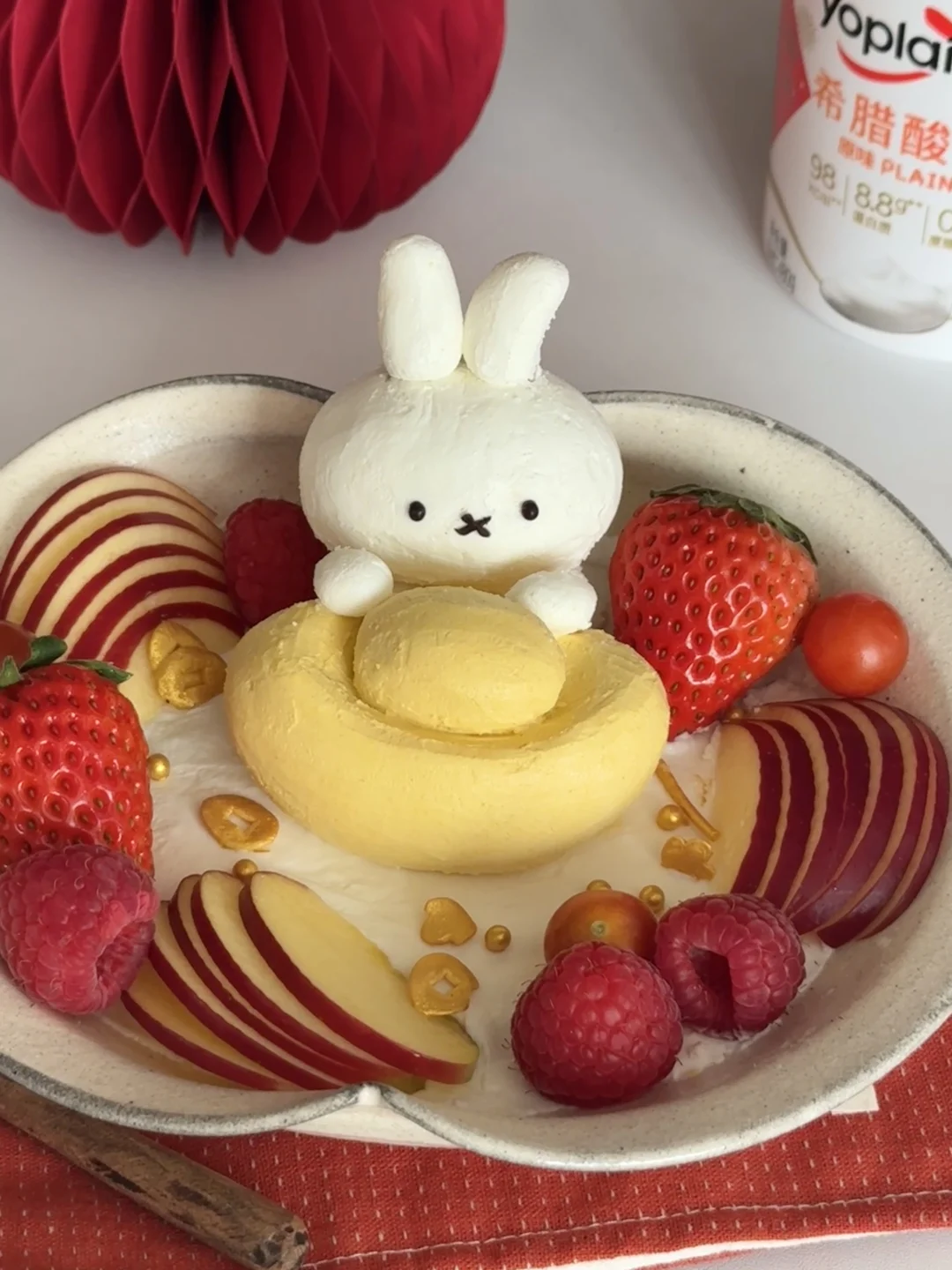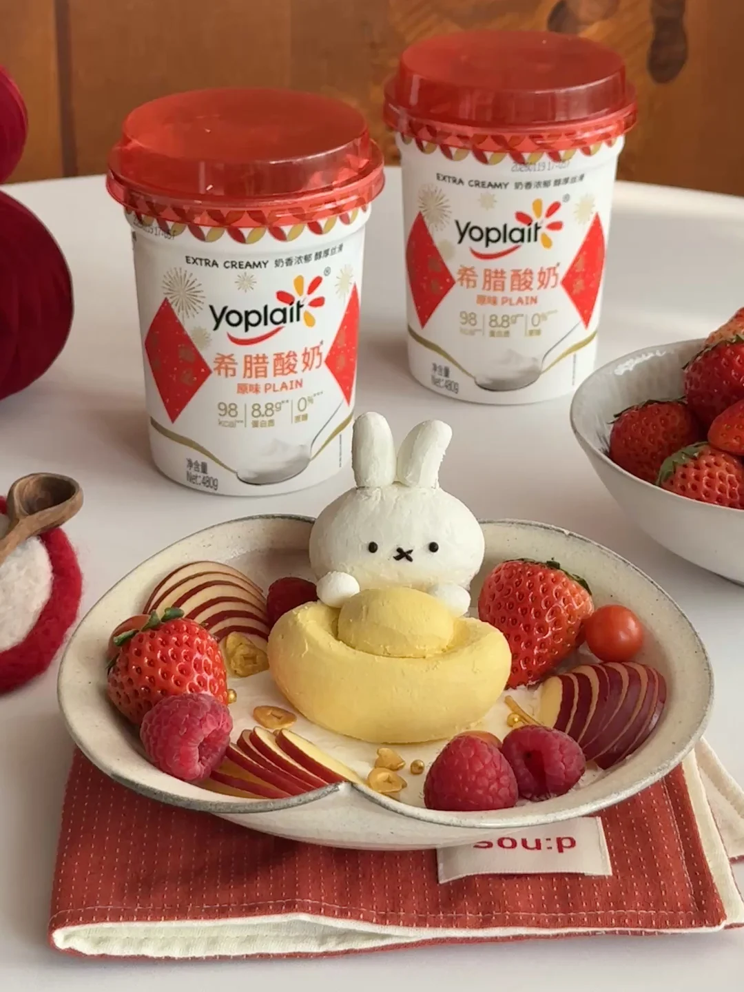 3️⃣盘里先用一部分原味希腊酸奶打底,黄色希腊酸奶捏出金元宝的造型,再用一部分原味希腊酸奶捏出米菲的造型,巧克力酱画上表情