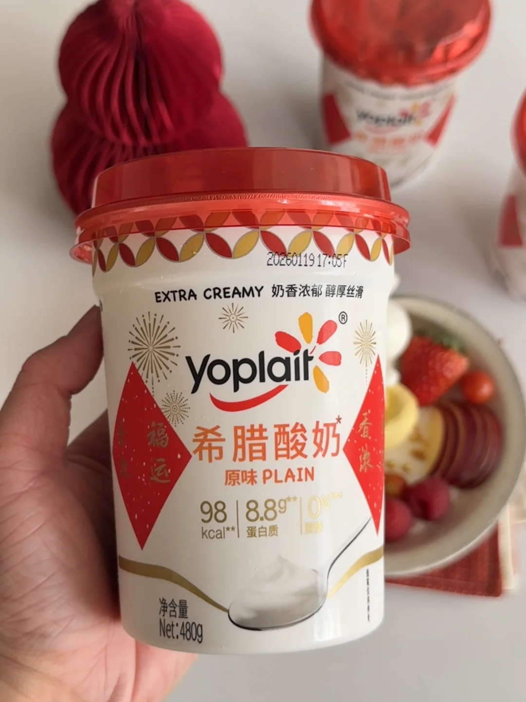 看了一眼配料表,里面干净得只有生牛乳和发酵菌,蛋白质含量高饱腹感强,新年在冰箱囤上几杯总没错,大鱼大肉后来上来一碗美味简单的希腊酸奶碗真的很nice✌️,而且搭配草莓树莓等莓果还能抗y!