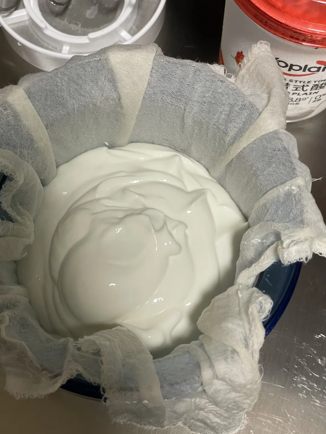 2️⃣过滤好的希腊酸奶一部分加南瓜粉调成黄色,另一部保留原色