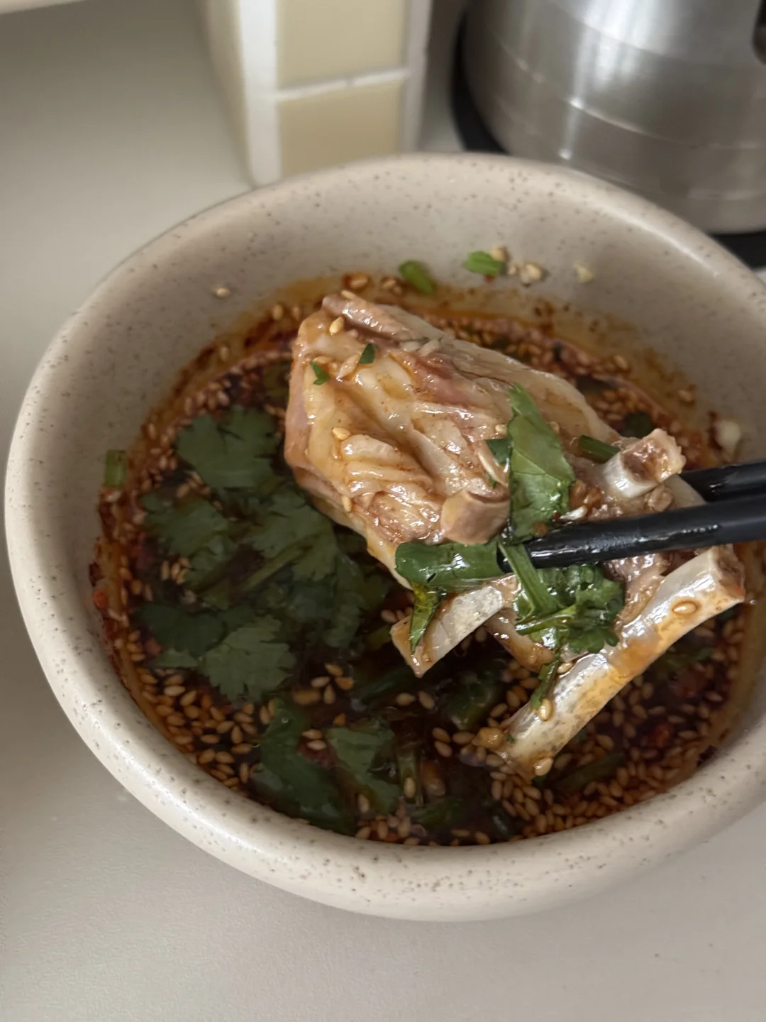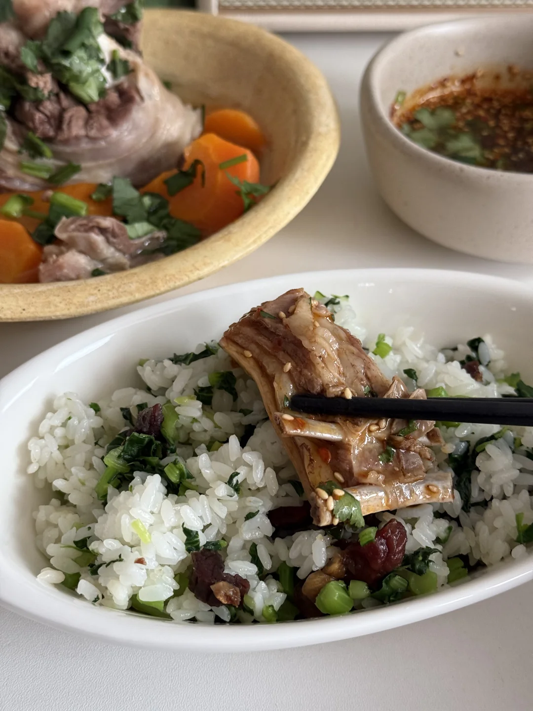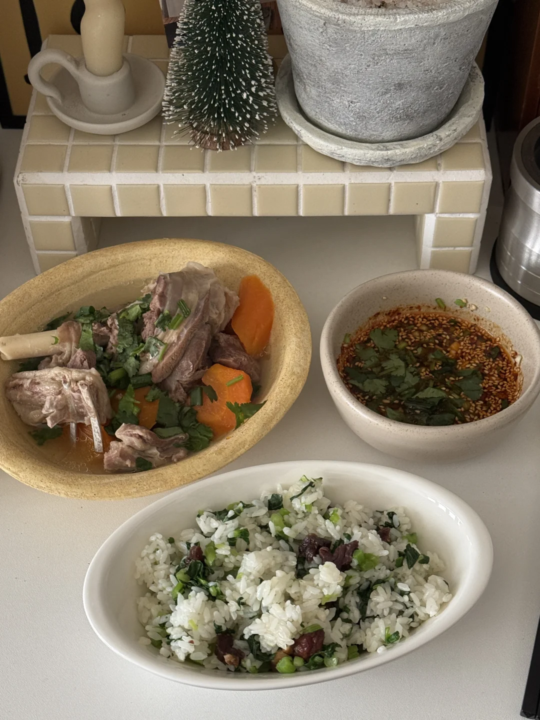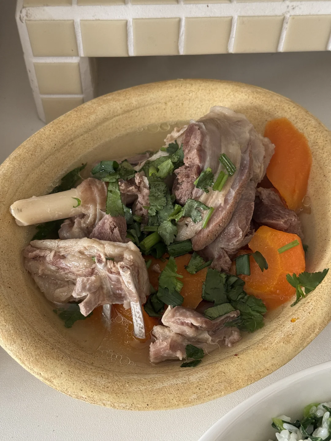 收到了新疆的羊肉 费了好大劲才给它🔪块 羊肉焯水后洗净用高压锅炖了20分钟 加入胡萝卜又压了5分钟🕤 - 今日午餐🥣 - ▪️清炖羊肉|酱油肉菜饭| - 给自己调了一个小蘸料 搭配羊肉真的巨巨巨好吃!