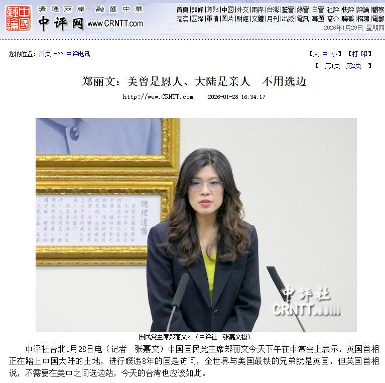 中国国民党主席郑丽文昨天(1月28日)在中常会上表示:“美国是我们的恩人,大陆是我们的亲人,绝对不会忘记美国的情谊,但也绝对做不出骨肉相残的事,不需要在美中之间做选择。‘我不能两个都选吗?’”,她强调,国民党将会扮演桥梁,不只让台海没事,也让美中和平稳定。 要知道这是在民进党当局持续炒作“抗中保台”叙事、美台勾连不断加深的背景下,台湾主要政党领导人首次用如此直白的语言,点破了台湾当下的现实处境——既无法割裂与大陆的血脉联系,也难以忽视与美国的现实关联,而普通民众最渴望的,从来都不是选边站队后的对抗,而是安稳日子里的和平发展。 郑丽文在这次中常会上的讲话长达26分钟,核心其实是为即将于2月2日至4日举行的“国共两党智库交流论坛”定调,这场时隔9年重启的交流,特意避开了敏感的政治争议,把焦点放在了观光旅游、医疗合作、能源共享、人工智能这些老百姓能直接受益的务实领域,由国民党副主席萧旭岑带队赴北京开展3天互动,这本身就传递出强烈的务实信号。 她在会上透露,这段时间有大量岛内各行各业的人,悄悄跑到国民党智库陈情,担心两岸关系继续恶化影响生计,可就连反映情况都不敢声张,怕被民进党当局“秋后算账”。 这一幕戳中了很多台湾民众的心声,毕竟在民进党执政的这些年里,“抗中”成了政治正确,两岸交流被人为阻断,旅游业、农业等依赖两岸市场的产业遭受重创,普通百姓的日子越来越不好过。 而“亲人”的说法,恰恰呼应了两岸同根同源的血缘事实,不管政治立场如何,台湾同胞与大陆同胞在语言、文化、习俗上的联系,是任何力量都无法割裂的,这也是“绝对做不出骨肉相残的事”的根本原因。 至于“恩人”的表述,更多是基于历史与现实的客观陈述,承认美国与台湾在安全领域的传统关联,但这并不意味着要依附美国,正如郑丽文随后的行动所证明的——就在1月27日,她带领国民党联合民众党,在台湾立法机构以55票对48票,第八次封杀了民进党提出的1.25万亿元新台币“特别防务预算”。 这笔预算名义上是“提升防卫能力”,实则既没有具体的武器采购清单,也没有成本效益评估,本质上就是变相给美国交“保护费”,而岛内超过五成民众都支持暂缓或削减军购,优先改善医疗、教育等民生领域,国民党的这一举措,恰恰是对主流民意的回应,也说明所谓“不选边”,并不是左右逢源的骑墙,而是拒绝被绑上对抗的战车。 这番表态自然引发了岛内蓝绿阵营的激烈攻防。民进党方面立刻抓住机会猛烈攻击,指责郑丽文“立场模糊”“混淆敌我”,甚至扣上“亲中媚美”的帽子,绿营控制的媒体更是连篇累牍地抹黑,说把大陆称为“亲人”是“背叛台湾”,把美国称为“恩人”是“忘记历史”。 但这些指责根本站不住脚,因为民进党当局多年来推行的“抗中保台”,并没有给台湾带来任何好处,反而让两岸关系持续紧张,经济民生举步维艰,越来越多的台湾民众已经看清了这一点。 而蓝营内部对郑丽文的表态大多表示认可,新党第一时间站出来支持,认为这是两岸关系重回正轨的重要契机,不少国民党籍“立委”也表示,这句话说出了台湾的真实处境,两岸是亲人,不能走向对抗,与美国保持沟通是现实需要,两者并不矛盾。 普通民众的反应则更接地气,有人觉得郑丽文敢说真话,终于有人替大家说出了对和平的渴望;也有人担心这种表述会被民进党拿来做文章,但更多做生意的民众直言,不管是“恩人”还是“亲人”,能让两岸恢复交流、让生意好做起来、让生活回归正常才是最重要的。 同样,1月28日上午,国务院台办举行例行新闻发布会,发言人张晗明确表示,要和平、要发展、要交流、要合作是岛内主流民意,大陆愿在坚持“九二共识”、反对“台独”的共同政治基础上,与包括国民党在内的台湾各政党、团体和各界人士一道,加强交流交往,保持良性互动,共同推动两岸关系和平发展,造福两岸同胞。 而即将举办的国共两党智库论坛,正是两党为台海谋和平、为民众谋福祉、为民族谋复兴的具体体现,符合岛内主流民意和两岸民众的期待。 她还指出,美国国防战略首次承认中国作为世界第二大国的地位,并且开宗明义说愿意与中国缔造和平稳定、相互尊重的关系,这意味着在国际社会看来,美中关系并非只有对抗一条路,台湾更没有必要被绑在选边站队的战车上。 国民党希望扮演“桥梁”角色,让台海成为“和平岛链”的起点,而不是“冷战前沿”,这种思路恰恰契合了当下国际社会渴望和平、反对对抗的主流趋势。 说到底,郑丽文的“恩人亲人论”之所以能引发这么大的震动,本质上是戳中了两岸同胞对和平发展的共同渴望。 不管是“亲人”还是“恩人”,和平才是发展的前提,而两岸同胞血脉相连,骨肉相亲,和平发展的道路越走越宽,才是对彼此最好的回馈。