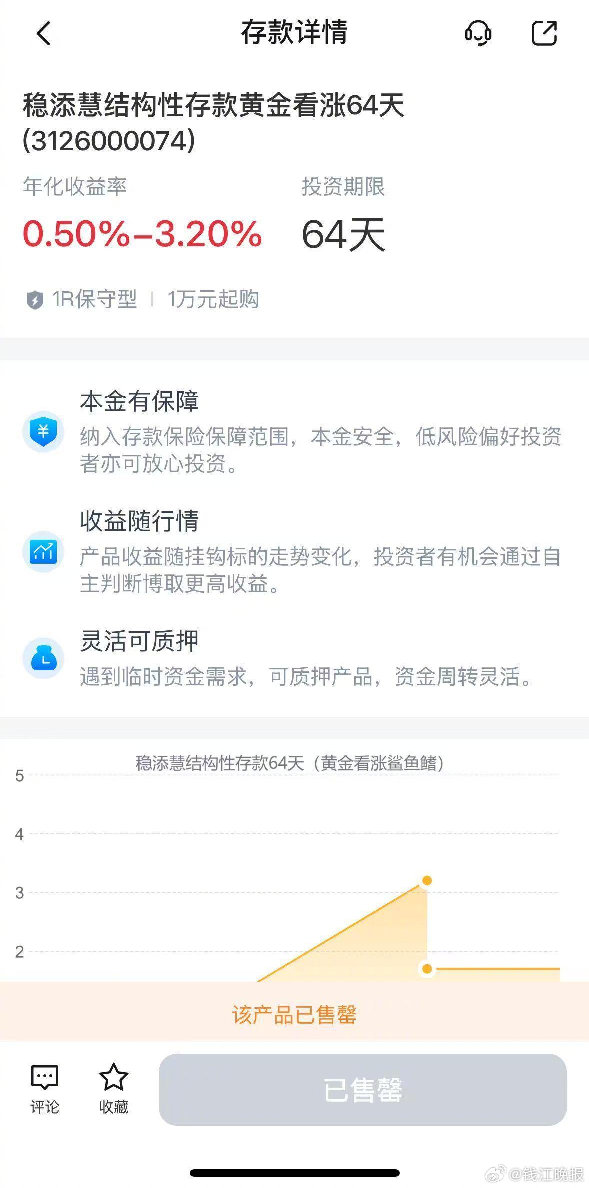 【#银行上架挂钩黄金产品承接到期存款#,有产品预期最高收益率达7.2%】近日,杭州白领林女士手头一笔10万元的存款即将到期,她开始为这笔钱的下一个“去处”感到发愁。去银行咨询时,客户经理热情地向她推荐了挂钩黄金的结构性存款:“产品能保本,金价要是一直涨,还有机会赚到3%的收益。”这让林女士颇为心动。伴随国际金价持续走强,银行推出的与黄金相关标的挂钩的结构性存款产品正在悄然走热。据了解,结构性存款是“普通存款+金融衍生工具”的组合,投资者本金纳入存款保险保障范围,利息则与黄金等标的波动挂钩,收益浮动但通常设有保底利率。1月27日,潮新闻记者走访了杭州市中心多家银行网点,了解当前在售的结构性存款产品。“我们前期与黄金挂钩的产品多为半年期,都卖完了,刚推出一款新产品。”广发银行工作人员表示。她向记者展示了一款名为“物华添宝”的定制版人民币结构性存款产品,产品投资期限为92天。产品详情页面显示,预期收益分为三档:1%或1.78%或2.3%。据工作人员介绍,该产品募集期为1月27日至2月2日,以1万元起购,属于保本型低风险产品。#奉劝大家还是尽量多存钱# 中国银行则推出的“跃盈-马上送福”产品,挂钩国际黄金/美元价格。产品期限为91天,预期年化收益率浮动范围较大,在0.2%至7.2%之间,也属于保本浮动收益类型。起存门槛为1万元,并以1000元为单位递增。该产品支持每日购买,灵活性较高。整体来看,当前各大银行推出的黄金挂钩结构性存款的起购门槛多数为1万元,期限通常在半年左右。不过,不同产品之间的预期收益率差异明显。另外,这类产品普遍能够保障本金安全,最终收益率则与挂钩标的(如黄金价格)市场表现直接相关,具体以产品到期实际结算为准。 (潮新闻 记者 陈晔)