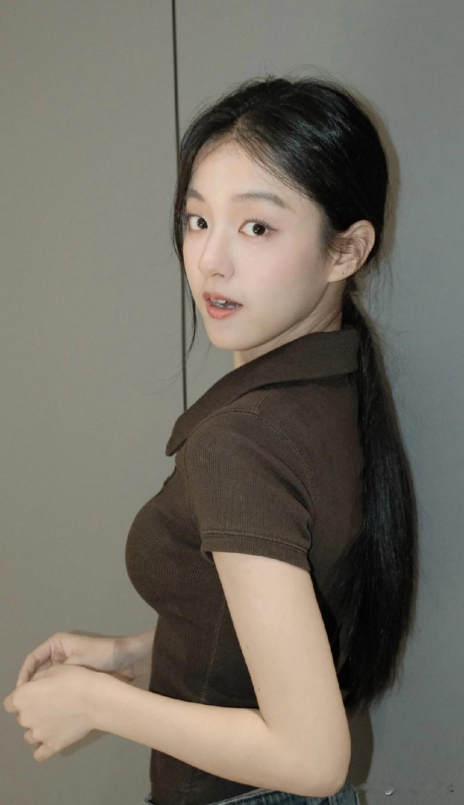 温柔甜美的少女,棕色短袖搭配牛仔裤,简约自然。