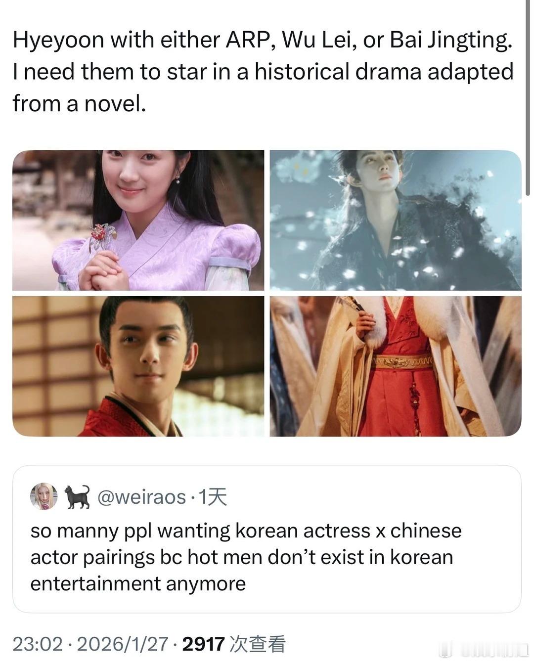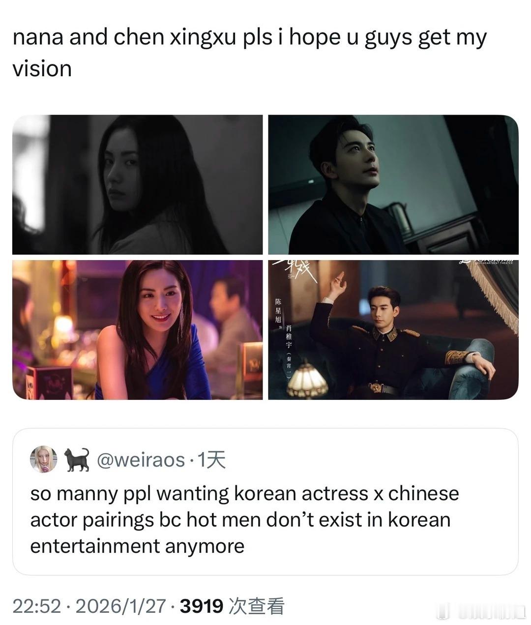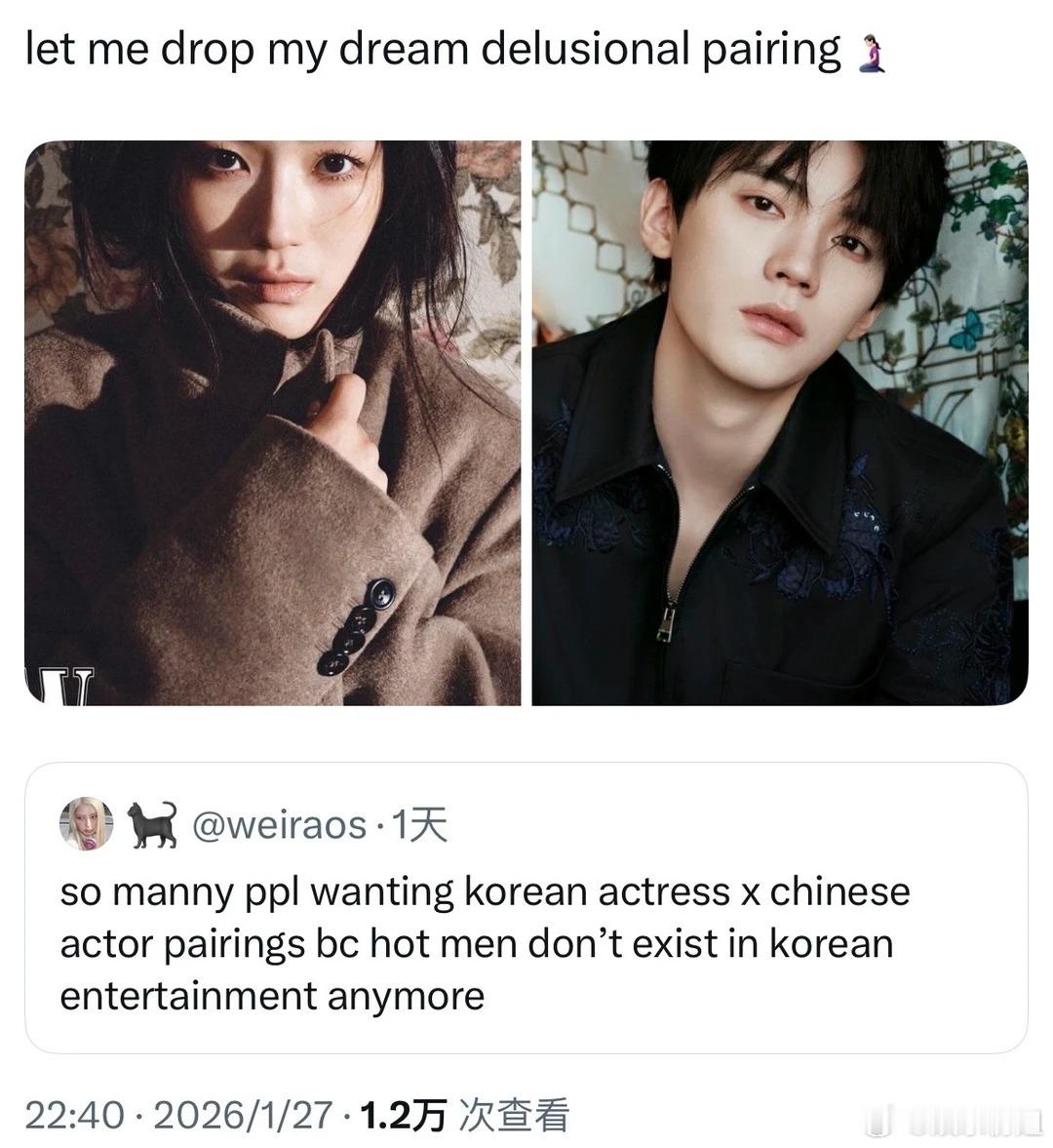 想看韩国女演员和中国男演员的CP外网热议:想看内娱生×韩剧花cp。我同意了谁来给