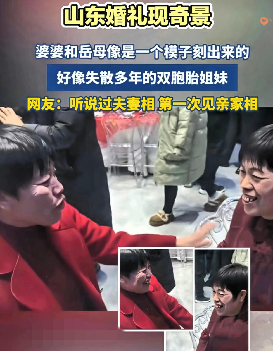 山东这场婚礼也太绝了! 新人父母一登场,台下直接集体惊呼,新郎妈和新娘妈简直像失散多年的双胞胎,相似度直接拉满! 俩人都穿喜庆红衣并肩而坐,眉眼、鼻子、嘴巴像一个模子刻出来的,笑起来眼角弯的弧度一样,说话侧头的小动作都神同步,不熟的宾客全以为是双胞胎姨母到场。 谁能想到,俩人年纪相仿,家隔四五十公里的小镇,儿女定亲前素不相识无半点交集,第一次见面就被这份撞脸缘分惊到,妥妥的冥冥之中的契合。 更难得的是俩妈妈一见如故,如今成了逛街买菜唠家常的闺蜜,背影看着比亲姐妹还亲。 其实婚姻最幸运的从来不是单方面的情投意合,而是两家人的同频合拍,亲家处成姐妹,是小两口往后日子和睦的底气,少了婆媳妯娌间的猜忌隔阂,这份天赐的缘分,比任何祝福都珍贵。 你见过这么有缘分的亲家吗?你觉得俩人长得像不像,换你第一眼能分清不?