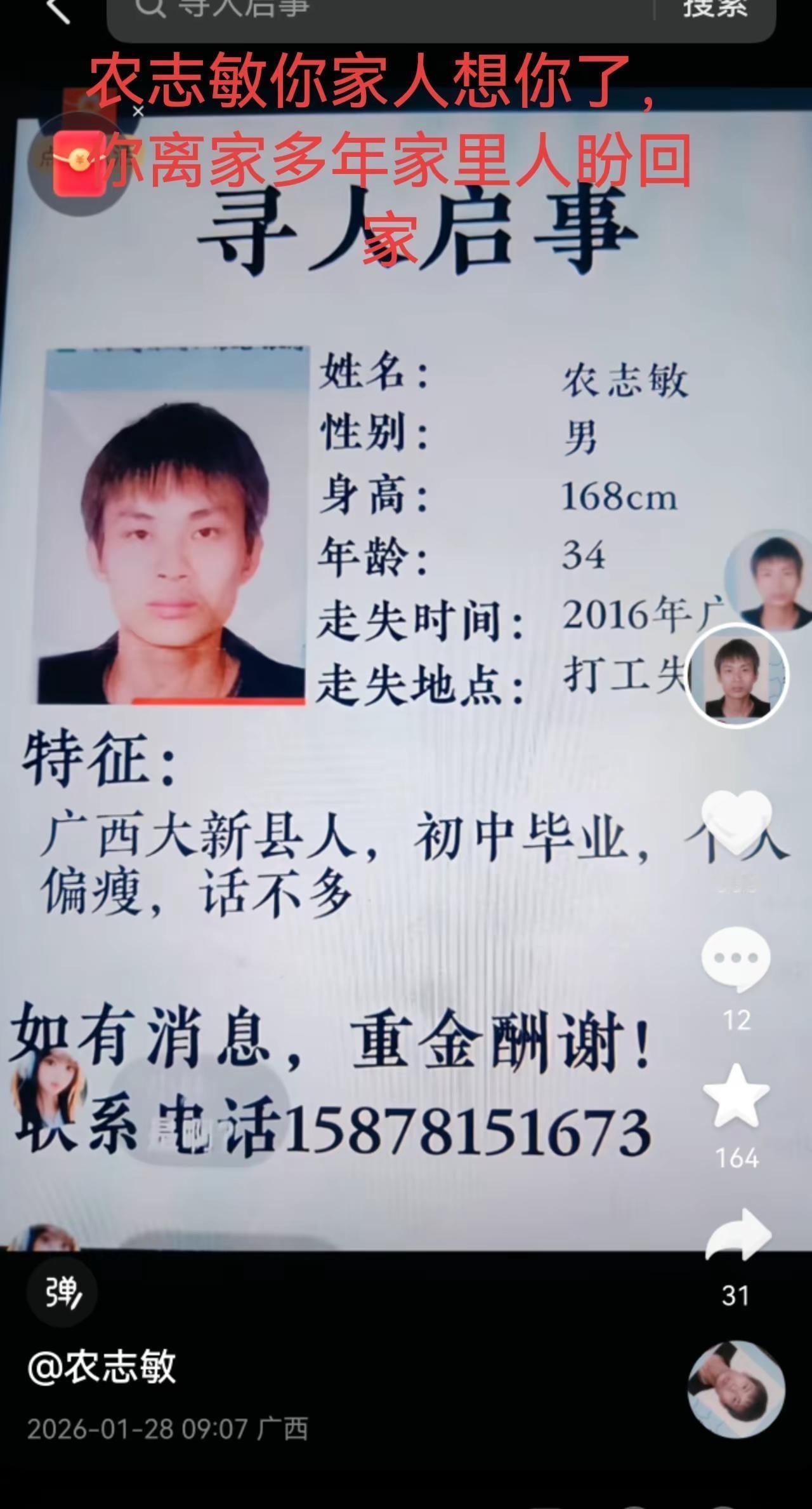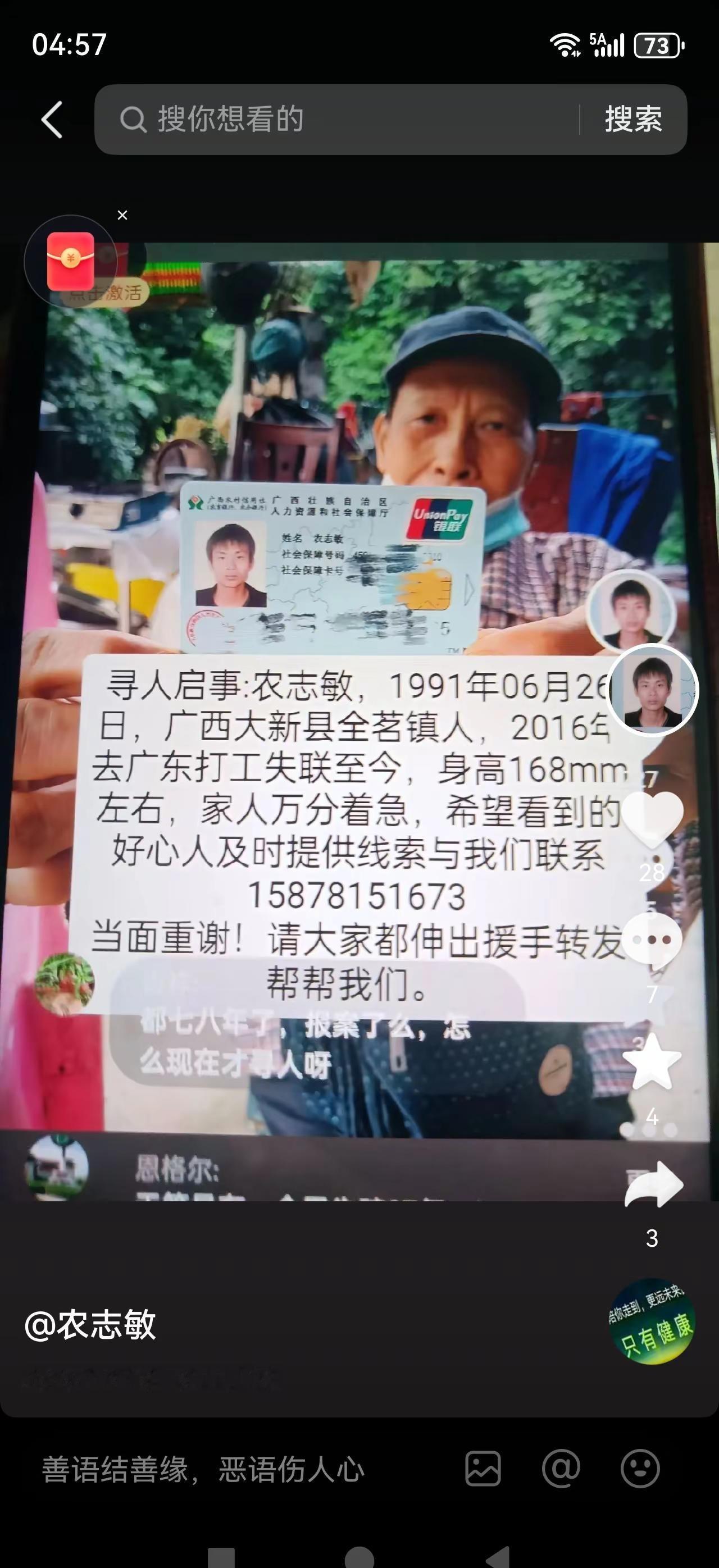 抖音的朋友们刷到这个视频的话,见到农志敏这个名字的话告知一下,因他妈生病了,他也离家多年没回了,他家人想他.…我是他堂姐
