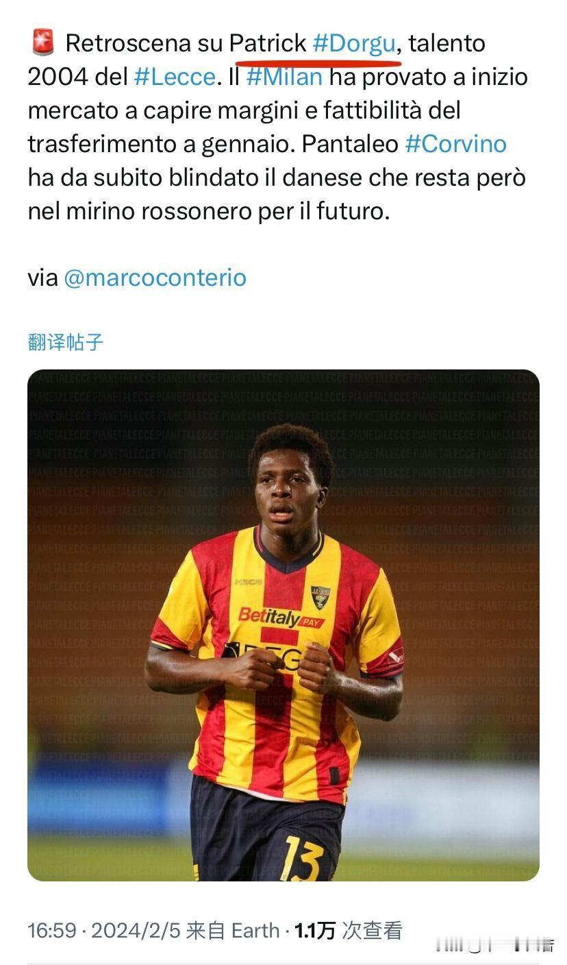 帕特里克·多古!米兰从未减少关于帕特里克·多古的兴趣,在转会窗口之初米兰俱乐部曾经试图了解了一月份转会的价格和可行性。 潘塔莱奥·科尔维诺立即保护了这位丹麦球员,但他仍然是红黑军团未来的目标。 这个帕特里克·多古貌似夏季窗口就各种可能性,当时看着就要签约了,那时候帕特里克·多古在莱切刚刚成为主力球员,这半个赛季表现很出色吗?看着数据貌似就是一个普通球员啊,这个帕特里克·多古国籍是丹麦,据说丹麦国家队曾经考察过,但没有下文了,可以理解为他的水平可能并没有被丹麦国家队主教练认可,这样的球员弄来怎么安排呢?送米兰未来队去? 之前有个叫辛格的当时可以免签,据说是皮奥利拒绝的,如果当时签约了辛格现在左右边翼卫就有了合适的替补,这个帕特里克·多古踢球风格有点像辛格,但他没有速度或者说缺乏爆发力,总之看集锦很少有速度过人场面,个人觉得如果需要补边翼卫,需要考虑弄一个和萨勒马克尔斯风格迥异的,萨勒马克尔斯不擅长速度,咋地也要买一个速度比较出色的。