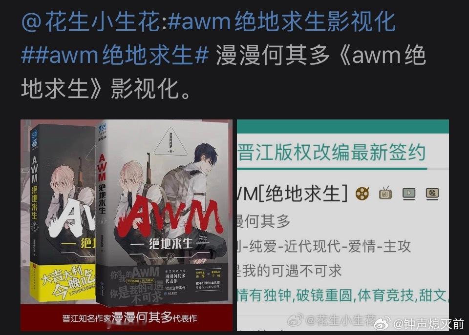 卧槽这本也要影视化了,看原耽的应该都听过漫漫何其多的《awm绝地求生》吧这书人设攻比受好,但很容易拍油腻