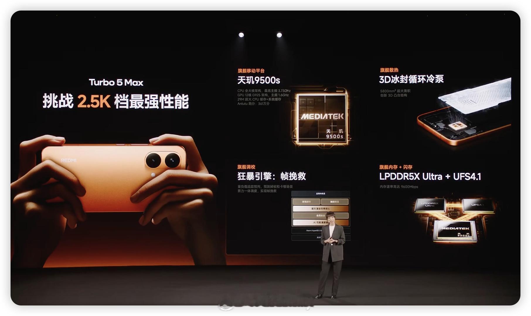 REDMI Turbo 5系列发布,2.5K性能猛地很。长续航和高性能全面兼得,帧率更优功耗更低,实力瞅得见!3D冰封循环冷泵,狂暴引擎协同全大核天玑9500s,重载预判,实力超群,很Max,性能很强很到位。9000mAh更比1万强,毕竟能量密度是真的强。红米Turbo5发布会 100W澎湃秒充,27W有线反充续航实用,也能应急给智能设备供电。