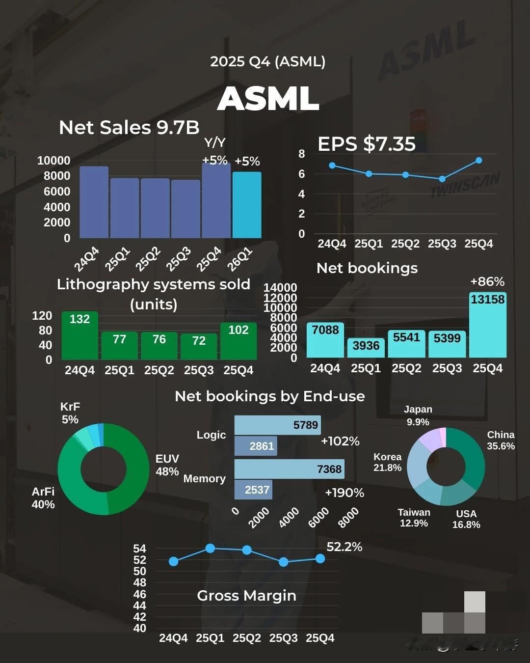 EUV设备龙头ASML订单及业绩展望! EUV设备龙头ASML的订单较上季度暴增143%,达到132亿(单位未明确,通常指欧元),创历史新高。其中,EUV设备订单为72亿,占总订单的56%。订单激增主要源于AI热潮下,存储芯片厂商积极扩充先进制程产能,其订单较上季度增加190%,达到74亿;逻辑芯片订单也翻倍至57亿。全年累计订单同比增长48%,达到280亿。ASML的订单积压(Backlog)总额已达388亿欧元。 关于2026年的展望,ASML预计第一季度(Q1)营收将在82亿至89亿(单位同上)之间,毛利率为51%至53%。全年营收预估在340亿至390亿(单位同上),同比增幅约12%。这一增长主要依赖EUV系统销量的显著提升,以及安装基础管理业务的持续增长。 CEO福凯(Fouquet)在展望中强调:“我们预计2026年将是ASML业务的又一个增长年。我们正持续在人才与产能方面投入,以支持2026年及未来的发展。” AI相关需求正持续扩张。从数据中心的AI训练芯片,到边缘设备的AI推理芯片,整个半导体行业正经历由AI驱动的结构性增长。这一趋势直接转化为晶圆代工厂对先进制程产能的需求。ASML管理层特别指出,客户对AI相关需求可持续性的评估变得更为积极,这一点已体现在订单量的显著回升上。 公司认为,到2030年有望实现440亿至600亿欧元的年营收,毛利率介于56%至60%之间。 (数据源自网络,仅供参考)