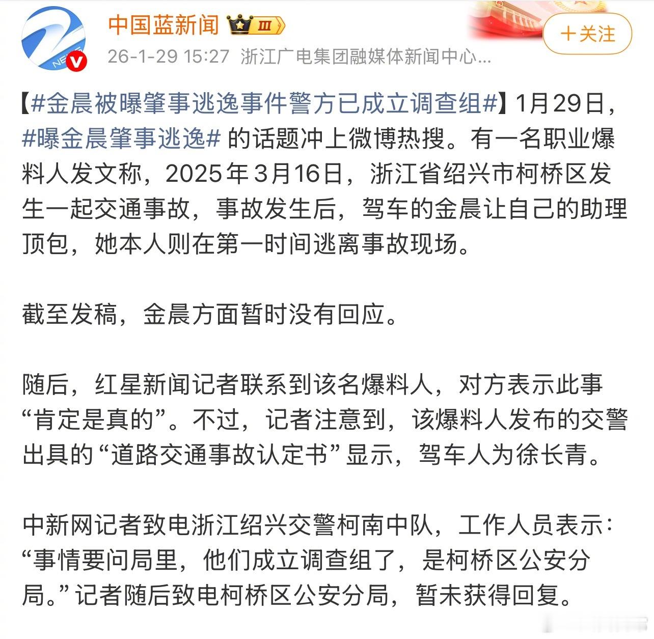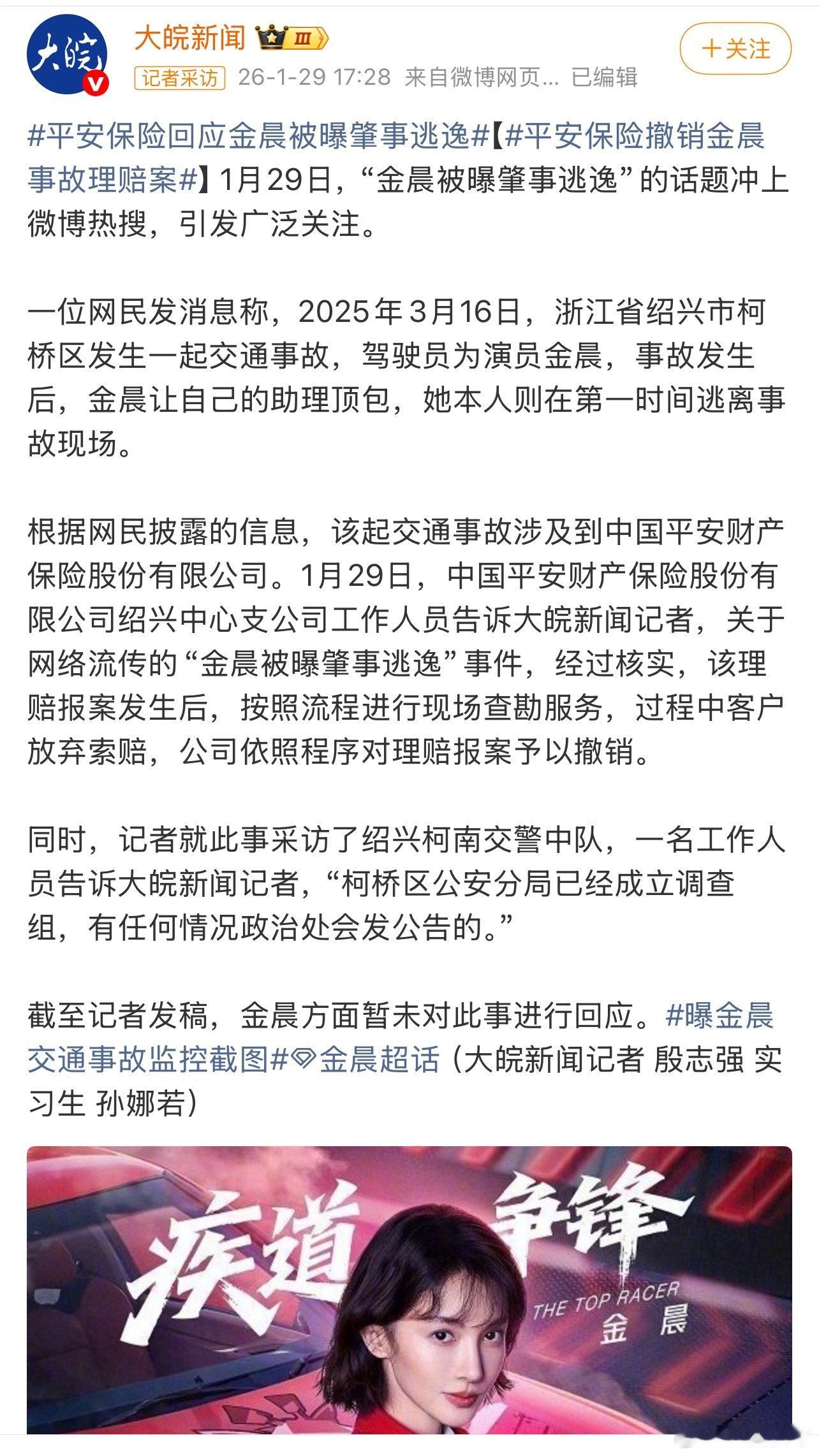 交警和保险公司都回应了曝金晨交通事故监控截图曝金晨肇事逃逸