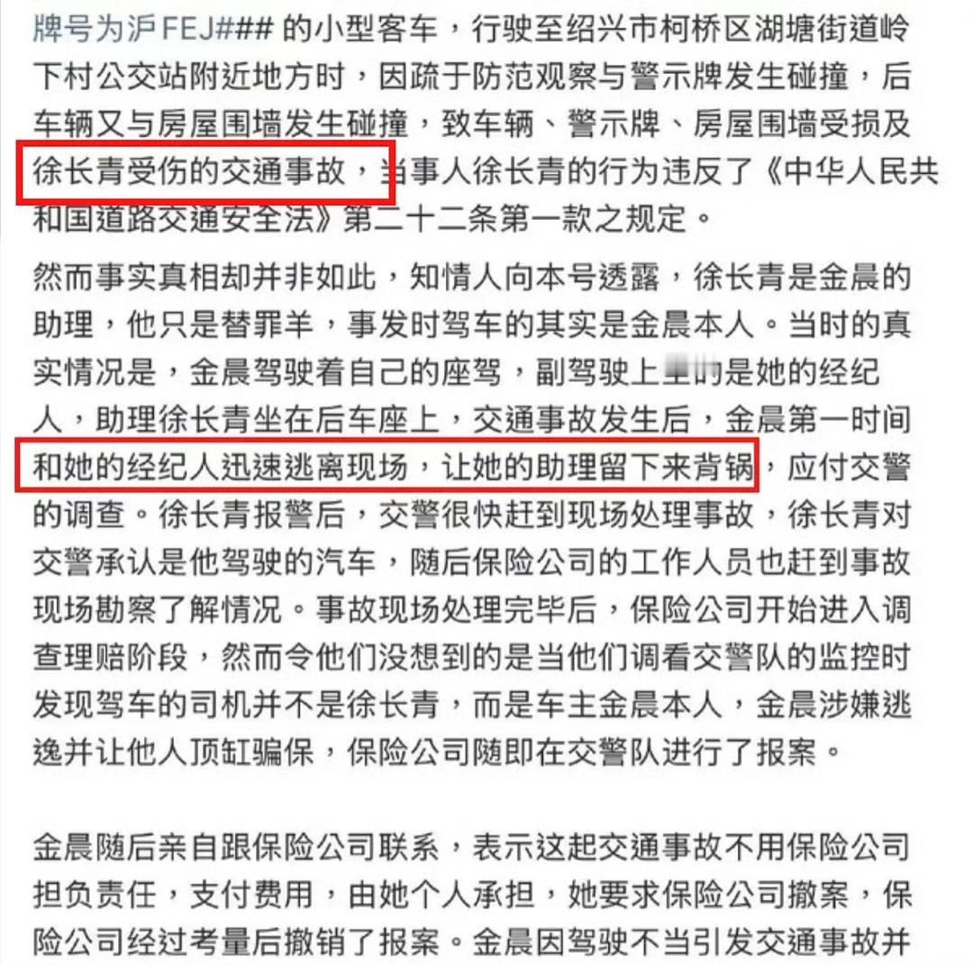 金晨这事儿有一点挺让人想不通 就开车不小心撞路牌,又不是啥天大的事,唯一受伤的还是她助理,赔点钱、走个正常流程不就完了嘛,为啥要跑路啊? 这一跑,性质可就变了,就算明星没脑子,团队经纪人也不可能让她这样干啊。 要说她酒驾吧,车上还有经纪人和助理呢,不至于让喝了酒的她开车,这可能性不大。 个人感觉更像是她急着赶飞机或者有其他要紧事儿,又觉得没撞到人,这事故也不严重,就把事儿扔给助理了。 只能说时隔一年,他们现在是有嘴也说不清了,如果真是赶时间,那我觉得还挺冤的,大家觉得呢?