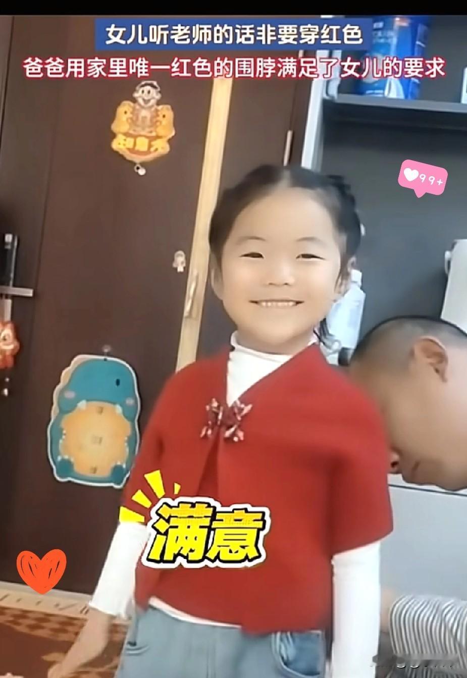 近日山东这位爸爸也太会了!女儿早上非要穿红衣服去幼儿园,妈妈才想起老师昨天说尽量穿,没准备也没关系,所以压根没当回事,这下孩子闹着不肯出门可愁坏了人。 没想到爸爸灵机一动,翻出家里一条红围巾,围着女儿小肚子绕一圈,从后背搭过肩膀绕到前面,领口和后腰各用夹子一固定,一件独一无二的红衣服立马成型,孩子穿上别提多开心了。 这哪里是简单改衣服,这分明是藏在细节里的极致宠爱!很多人觉得爱孩子要花大钱买好东西,其实真正的爱从不是物质堆砌,而是愿意为孩子的小执念花心思,把不起眼的小事做成惊喜。 这种用心的父爱最动人,它能让孩子从小就充满安全感,知道自己的小小心愿永远有人放在心上。你家娃有没有过这种小执拗,你又是怎么温柔满足的呢?