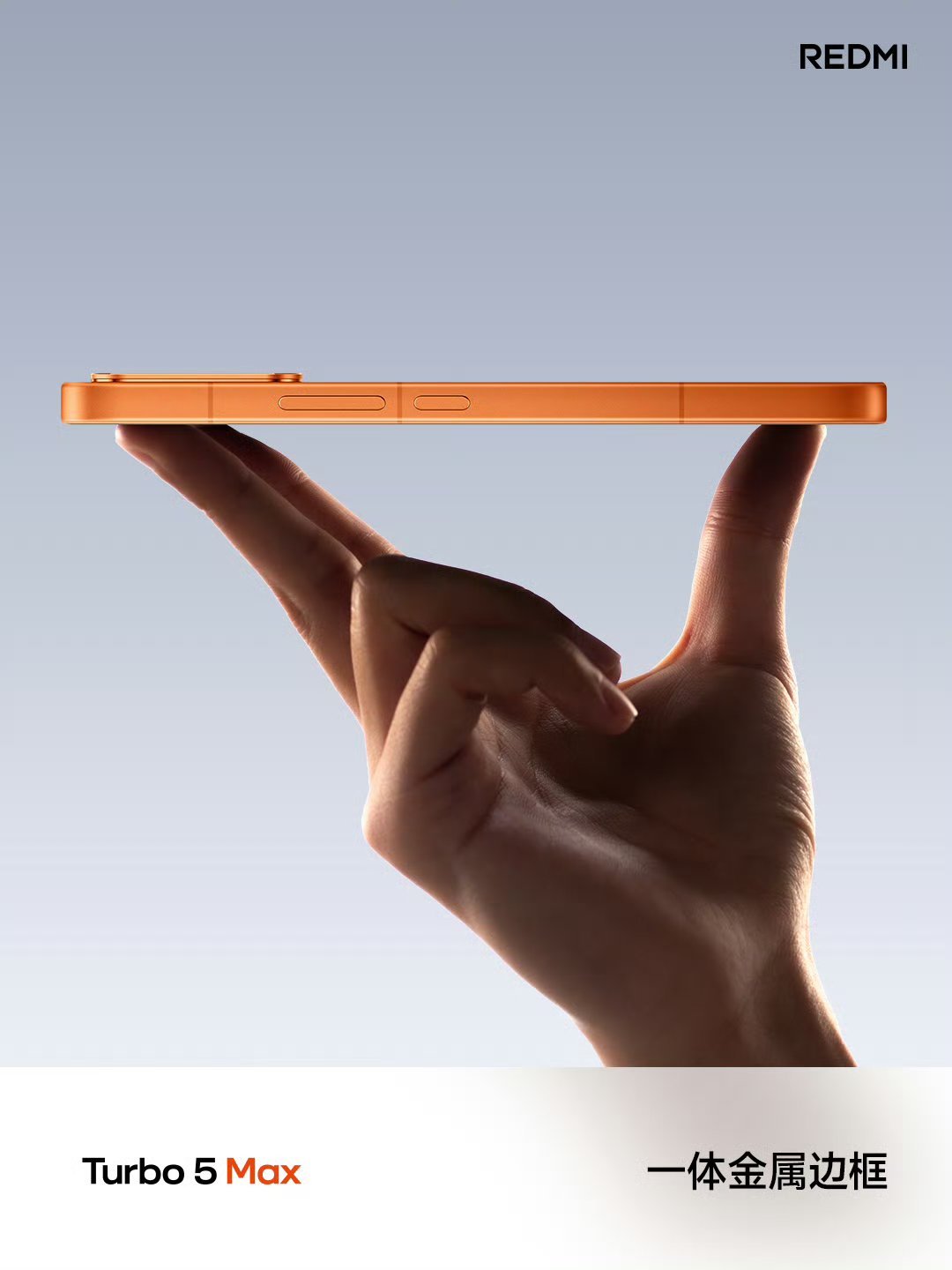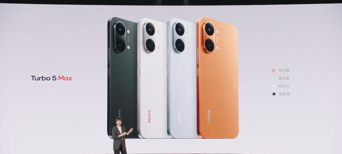 暗影黑、祥云白、海风蓝、阳光橙四款配色,金属中框,玻纤后盖,红米Turbo5发布会 Turbo5Max质感 Max,全面比肩旗舰CNC 金属中框,线条简约流畅,精致感扑面而来旗舰玻纤背板,更高级光感,手感温润轻巧金属跑道型 Deco,双环涡轮灯带,诠释性能美学