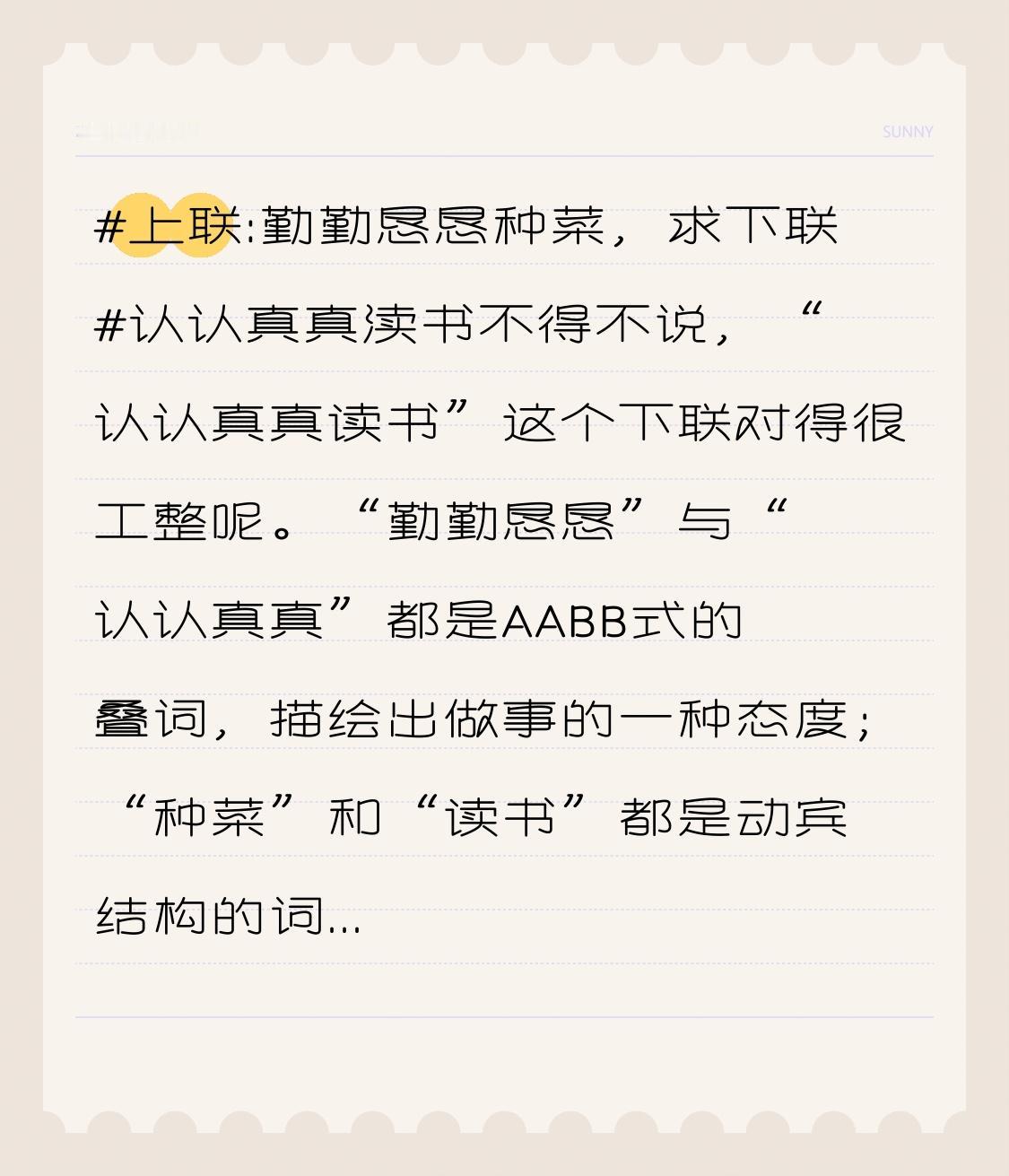 其实围绕这个上联,还能有不少精彩下联。比如“兢兢业业上班”,“兢兢业业”同样展现出一种全身心投入、踏实努力的工作状态,“上班”则和“种菜”对应,都是人们日常从事的事务。 再如“本本分分做人”,“本本分分”体现出为人处世的忠厚老实、恪守规矩,“做人”相较于“种菜”有着更深远的人生意义,从生活小事升华到了人生准则层面。 对联的魅力就在于这种文字的对仗和意境的呼应,大家还有什么更妙的下联,不妨在评论区分享呀。
