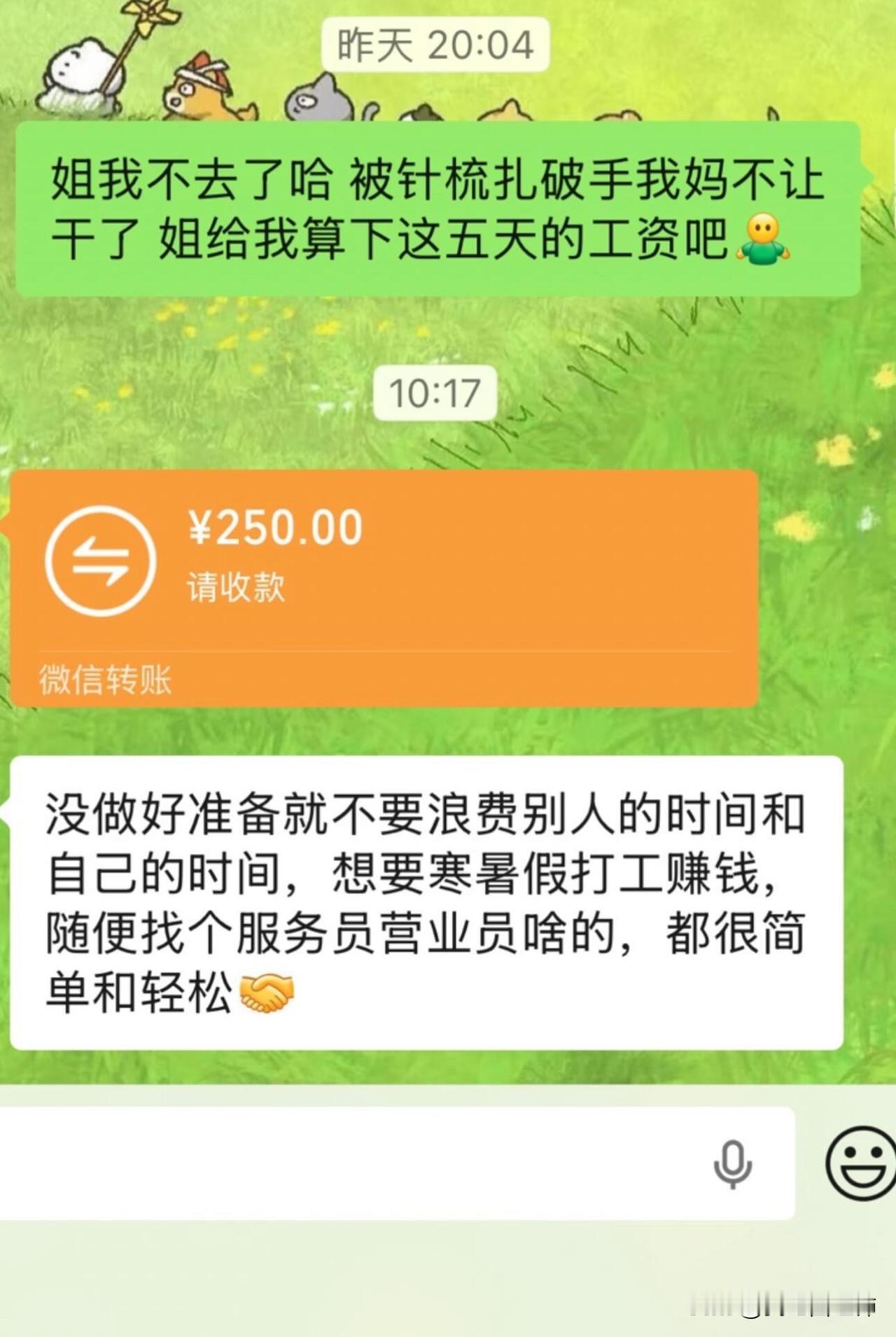 时薪5r寒假工遭遇不公平对待,怎么反击 别再说我没做好准备,我因为喜欢小动物才来,脏活累活都干了,也从没抱怨过。时薪只有5块,一天要干10个多小时,连固定吃饭时间都没有,每次都得我自己看情况请示,你同意了我才能去。干了五天,你们连我名字都不问,只会用“你”使唤我,还总在店里抽烟,让我吸二手烟。四个人点奶茶就没我的份,平时也把我排除在外,刻意孤立。我不是吃不了苦,是这里连最基本的尊重都没有,我没必要继续待下去,不用教育我。