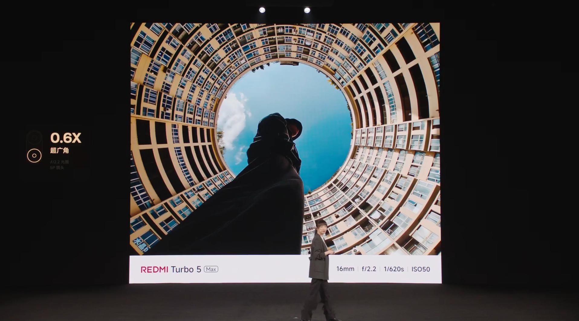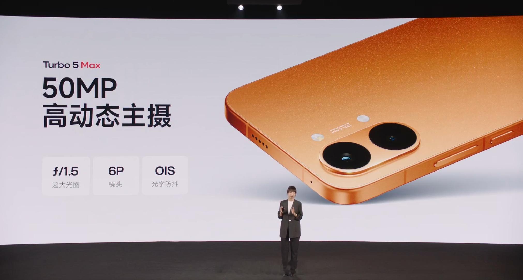 REDMI Turbo 5 Max 前置 20MP(豪威 OV20B,1/4"),后置 50MP 主摄(光影猎人 600,1/2",12.5EV 动态范围,OIS)+8MP 超广角(思特威 SC821CS,1/4"),对中端性能机来说够用了。红米Turbo5发布会