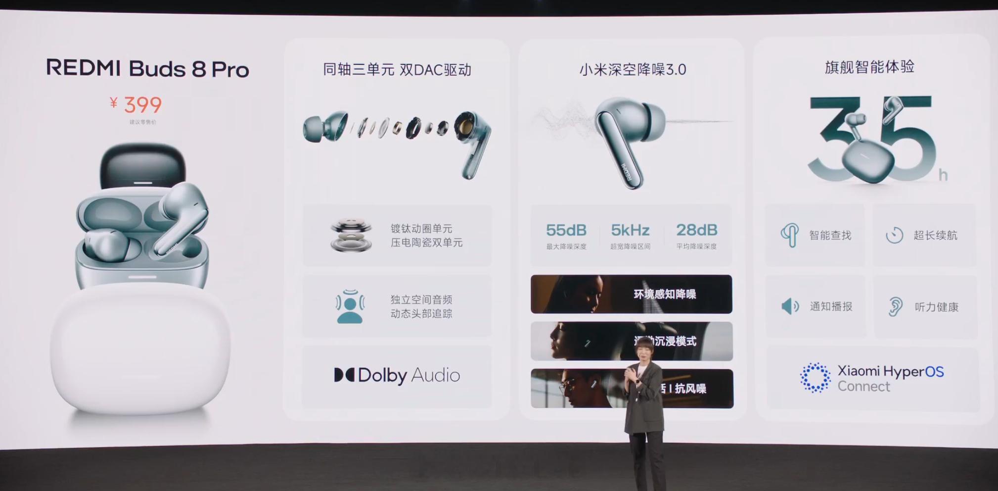 REDMI Buds 8 Pro 发布,售价 399 元。圈瓷同轴三单元设计,11mm 镀钛动圈单元 + 双 6.7mm 压电陶瓷单元,支持 SBC、AAC、LC3、LHDC 5.0 及小米自研 MIHC 编解码协议,通过 Hi-Res 认证,内置六轴陀螺仪传感器,支持独立空间音频,首次实现 Dolby Audio 音效;4 种预设 EQ,支持自定义 EQ 调节;小米深空降噪 3.0,支持 55dB 降噪深度,5kHz 宽频主动降噪,平均降噪深度 28dB,内置通勤沉浸模式;3 麦克风阵列,提供 3 档通透模式;支持双设备连接、音频自动流转、音频共享与智能查找功能;单次续航 8.5 小时,配合充电盒总续航 35 小时,充电 5 分钟,聆听 2 小时;支持 IP54 防尘防水;冰釉白、玄悟黑、薄雾蓝 3 款配色。红米Turbo5发布会