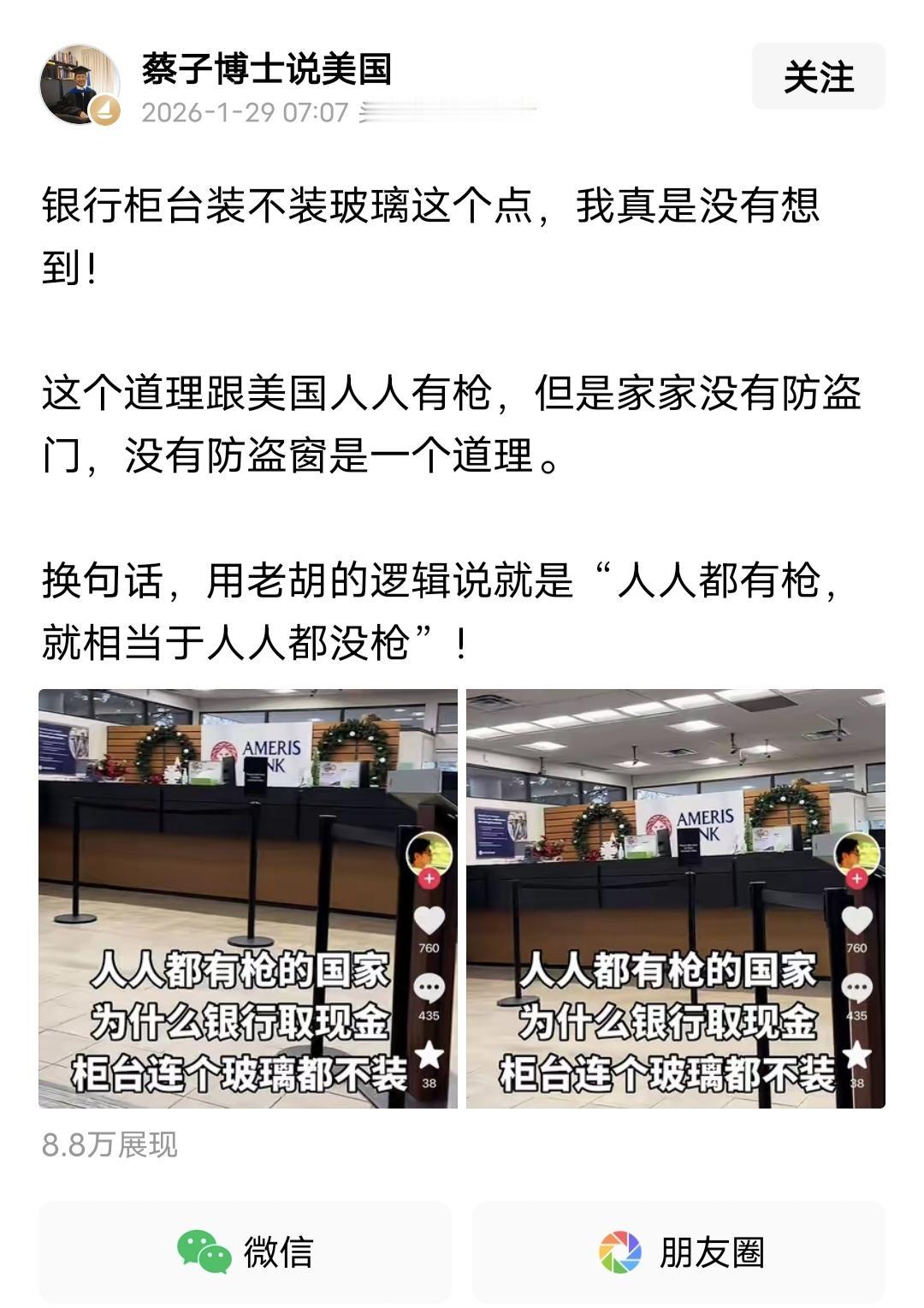 这位润人博士,在头条吹嘘美国银行没有玻璃,以此暗示他的精神故乡是多么的安全和文明。我真担心特朗普看见了会捶死他,上次老特在宾夕法尼亚州演讲时,但凡安一块防弹玻璃,也不至于丢了半只耳朵,不过后来他总算学乖了,不管是去看球还是去演讲,都躲在厚厚的防弹玻璃后面,总算是撑到了现在。