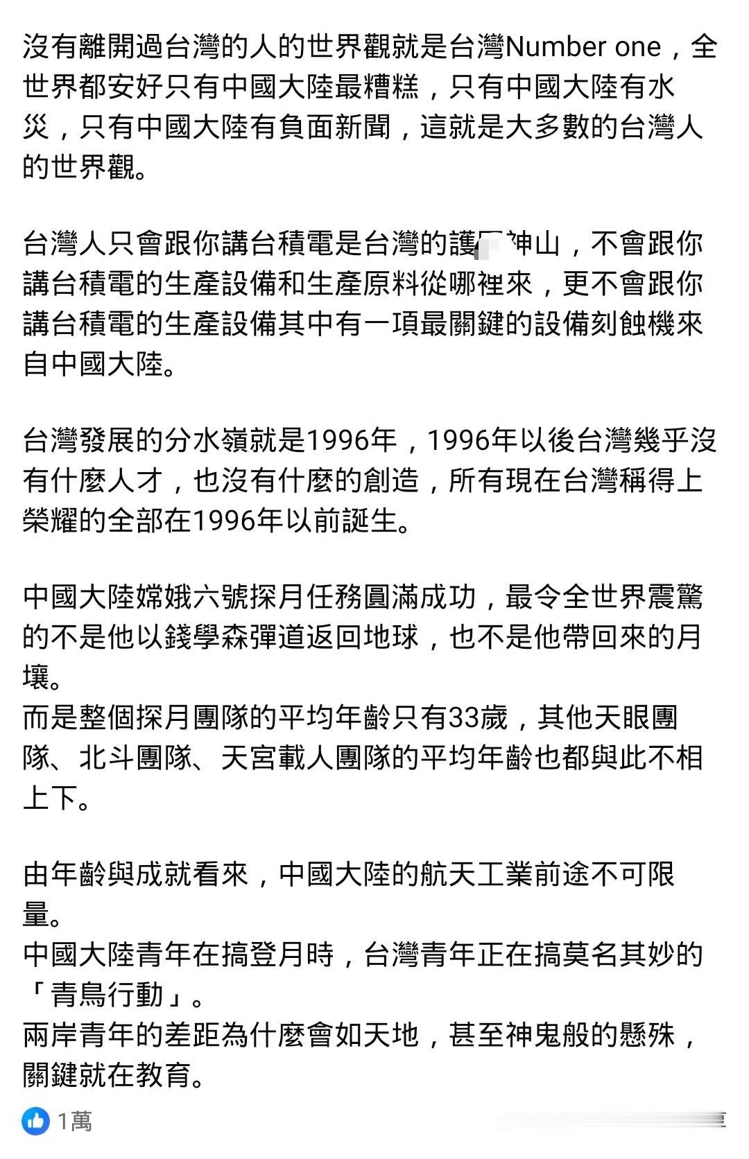 【转贴】陈文茜:整·個·台·湾·都·在·進·行·愚·民·教·育· 陈文茜指出愚民教育的分水岭是1996年。可她没有进一步阐述1996是什么的开始? 过去,两岸虽然政治对立,人民却是骨肉天亲。 是什么时候,又是什么样的需要,使得原来的亲缘关系开始被否定?岛内想“堂堂正正做中国人”的,开始变得“偷偷摸摸”,一个沿续五千年代灿烂文化被视为落后、不文明,取而代之的是一种刻意求异的恋殖情节——什么多元移民社会,什么被殖民愈久就愈文明……,最可怕的是,当这种声音频繁出现在社会上时,反对的声音却越来越薄弱…… 当然,作为旁观者,我们自是知道变异的源头始于何处? 可局内人,如果自己看不清这一点,岛内愚民教育仍会继续下去,两岸年轻人的视界及未来,只有越拉越远,至少统一前如此…… Source:FB