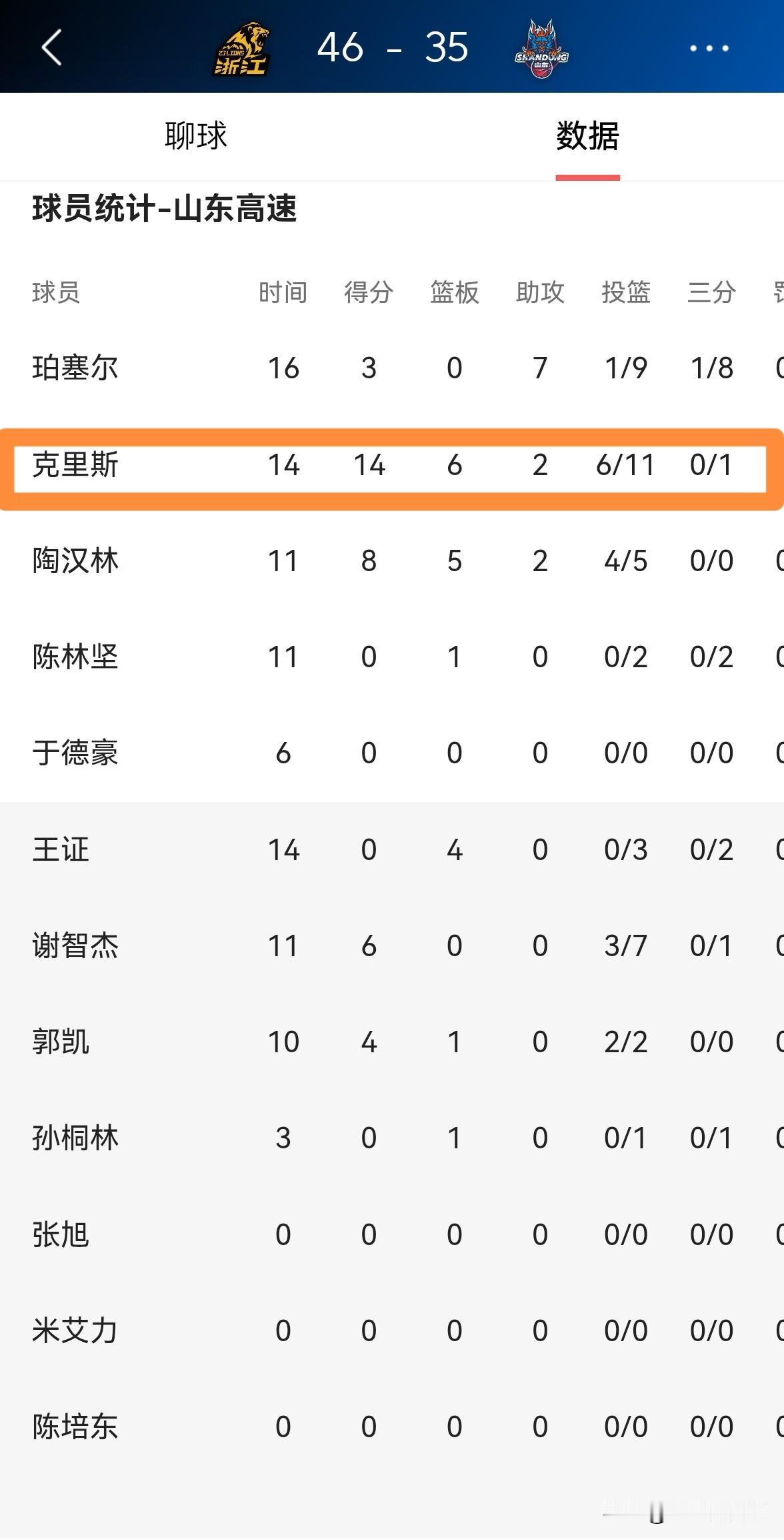 山东高速外援克里斯真是大发神威!在今天山东高速客场挑战浙江方兴渡的比赛中,目前双方半场战罢,虽然山东高速以35:46落后于对手,但是克里斯的表现却非常的亮眼。 在前两节比赛中,克里斯首发出战14分钟,投篮11中6,其中三分球1中0、罚球3中2得到14分,外加6篮板2助攻2盖帽。 事实证明,当克里斯能够在比赛中控制好自己的情绪,他依然是当今CBA最出色的内线之一。