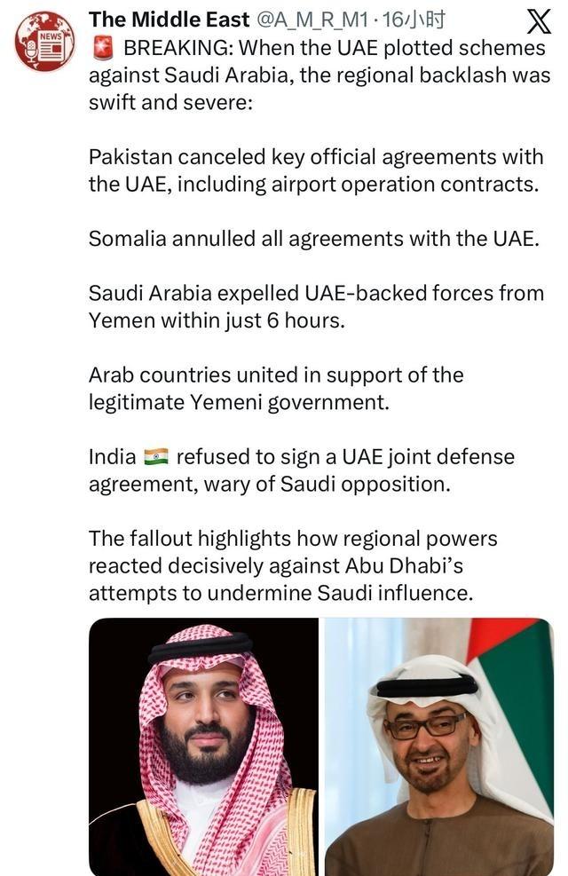 突发新闻:当阿联酋密谋反对沙特阿拉伯时,地区反弹迅速而强烈:巴基斯坦取消了与阿联酋的关键官方协议,包括机场运营合同。索马里废除了与阿联酋的所有协议。沙特阿拉伯仅用6个小时就将阿联酋支持的部队驱逐出也门。 六个小时,甚至都不够咱们喝顿大酒的功夫。 但在中东这片地界,这就足够变天了。就在大家还没反应过来的时候,沙特阿拉伯干了一件狠事,直接把阿联酋在也门的势力连根拔起。这一手“闪电战”,真的是快、准、狠。 红海两边的风声紧得很。大家眼珠子都盯着加沙或者伊朗,但咱们这种老军迷心里清楚,真正的“大瓜”其实在沙特与阿联酋身上。这场兄弟阋墙的戏码,不仅让也门的局势瞬间反转,更引发了从巴基斯坦到索马里的一连串连锁反应。 长期以来,阿联酋在也门南部扶持的“南方过渡委员会”(STC),一直是利雅得方面的一根刺。沙特想要的是一个统一、听话的也门,毕竟那是人家南大门的安全屏障;阿联酋呢,更像个精明的生意人,盯着港口以及航道,甚至不惜把也门拆了。 前几天,这种矛盾彻底压不住了。利雅得那边发现阿布扎比在搞“小动作”,也没废话,外交辞令都省了,直接动手。阿联酋支持的武装力量在极短时间内就被缴了械,被踢出了关键阵地。这一巴掌打下去,谁是阿拉伯半岛真正的老大,一目了然。 这还只是第一张倒下的多米诺骨牌。 紧接着,在这个特殊的1月中旬,巴基斯坦突然出手了。这个拥有核武器的南亚大国,平时跟海湾国家关系都不错,但这回站队站得干脆利落。伊斯兰堡方面直接宣布:取消与阿联酋的关键官方协议,连机场运营合同都停了。 拿这事儿来说,机场运营可是关乎国家脸面以及命脉的大生意。巴基斯坦这一手,摆明了是告诉阿布扎比:你们最近做事太过了,连我们这些老朋友都看不下去了。 反应最激烈的其实是索马里。 当地时间1月12日,索马里内阁开了个急会,随后甩出一份决议:即刻废止与阿联酋签署的所有双边协议。大家注意,是“所有”。从港口运营到安全合作,再到国防领域,全都不算数了。索马里防长话说得很重,直指阿联酋的行为正在削弱索马里的主权、民族团结与独立。 为什么索马里发这么大火?咱们得往深了看。 去年底,以色列突然承认索马里兰的“独立地位”。要知道,索马里兰虽然自1991年就单方面喊着独立,但联合国里可没谁搭理它。以色列这一出,背后要是没人牵线搭桥,根本成不了。而在非洲之角跟以色列打得火热,又在索马里兰砸了重金投资的,除了阿联酋没别人。 很多索马里人心里明镜似的:阿联酋这就是在玩“借刀杀人”。 阿联酋的迪拜世界港口公司(DP World)手握索马里兰伯贝拉港30年的特许经营权。这港口位置太刁钻了,掐着红海的脖子。为了这个港口,阿联酋不惜绕过索马里中央政府,直接跟分裂地区搞合作。 更离谱的是,就在1月8日,那个让沙特头疼的也门南方领导人祖拜迪,居然经由伯贝拉港飞往阿联酋,直接绕开了沙特主导的和平谈判。这不仅是占便宜,简直是把主人的脸放在地上踩。 所以,索马里这次是彻底掀桌子了。虽然索马里兰那边还在嘴硬,说阿联酋是“值得信赖的朋友”,但摩加迪沙的清退令已经下达。这不仅仅是钱的事儿,更是阿联酋在红海战略布局的一次大翻车。 回头看这一连串事儿,咱们能品出不少味道。 沙特与阿联酋,这对曾经并肩作战的兄弟,在核心利益上早就尿不到一个壶里去了。沙特要的是作为伊斯兰世界盟主的政治面子以及地区稳定;阿联酋要的是实实在在的商业版图以及海上控制权。 当阿联酋为了自身利益,开始在苏丹支持快速支援部队,在也门搞分裂,甚至把以色列拉进非洲之角事务时,这就动了沙特的根基。 既然“兄弟情义”不管用,那就只能拿实力说话。6个小时的军事驱逐,就是最直白的大耳刮子。巴基斯坦与索马里的跟进,说明在更广泛的圈子里,大家对这种破坏规矩的小动作,已经忍无可忍。 现在的中东,早就不是当年那个只要美国人喊句话大家就排队站好的时代了。 印度这次也很鸡贼,直接拒绝签署阿联酋的联合防御协议,理由很简单:担心沙特反对。你看,连新德里都看出来了,这时候得罪利雅得绝对没好果子吃。 当一个国家把生意做得太“独”,甚至不惜牺牲盟友利益时,反噬是迟早的事。 这给咱们看客上了一课:哪有什么牢不可破的盟约,国家利益才是硬道理。