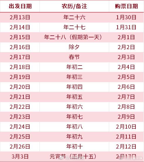春运高峰票明日开售春节车票不好买!错过了买机票可齁老贵的明日将开售2月13日也就是年二十六的火车票1月30日可购买年二十六(2月13日)的火车票;1月31日可购买年二十七(2月14日)的火车票;2月1日可购买春节假期第一天(2月15日)的火车票;2月9日可购买大年初七(2月23日)的返程火车票;2月17日可购买元宵节(3月3日)的返程火车票。