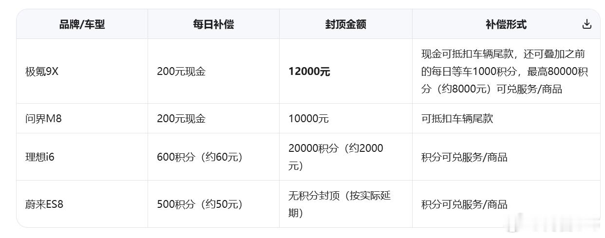 交付不出来给赔钱,各家都是怎么“赔”的?(看图)最高能有1万2呢以前等车也白等,现在能拿补偿了。是个好事儿,开始提升服务颗粒度了,不管送积分还是送钱,都是对用户时间的尊重大v聊车问界m8理想 i6极氪9x蔚来es8