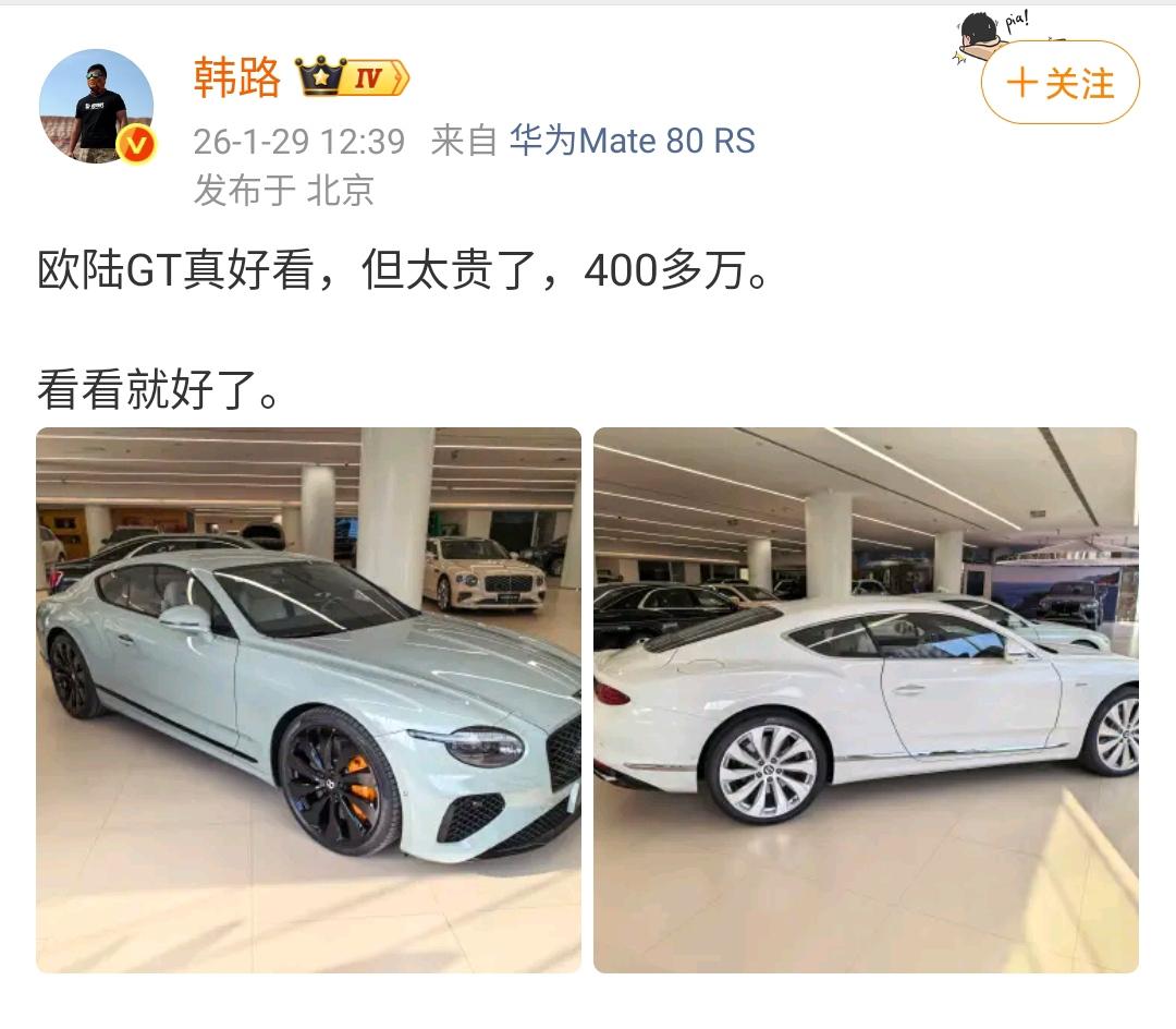 韩路:欧陆GT真好看,但太贵了,400多万。看看就好了。 连知名车评人都说看看就好,确实普通人离这款车实在是太远了,买这么贵的车,身价没有个几千万也不会买这种车。 大多数消费者这一辈子能够买一个四五十万元的车已经非常不错了,对于工薪家庭,有个10来万元的车开开就挺不错的了。