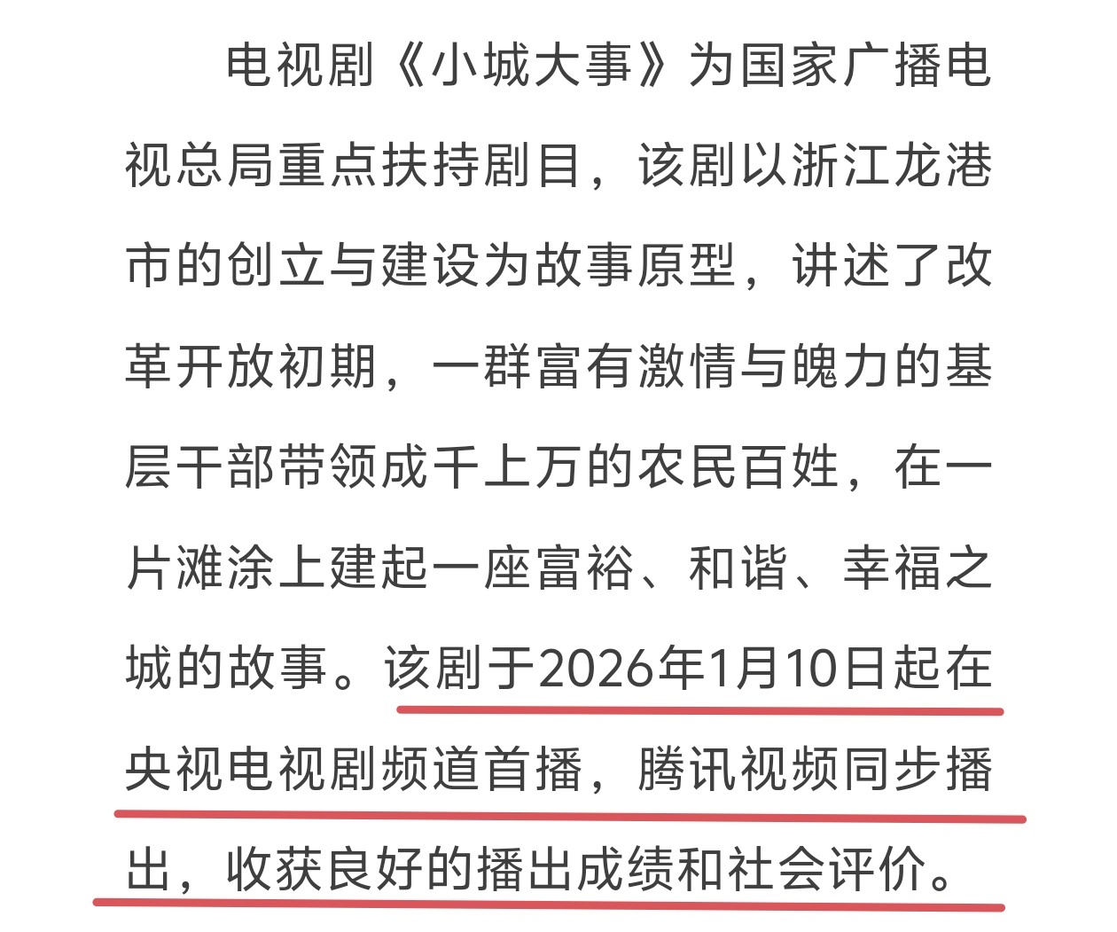 小城大事今日研讨会内容一览:就小城大事口碑,收视率给予高度评价“《小城大事》获得了收视与口碑的双丰收,播出之后斩获多个热搜话题,既印证了主流题材的强大生命力,也证明了优质的现实题材作品能够打破年龄圈层,实现跨代际传播。”
