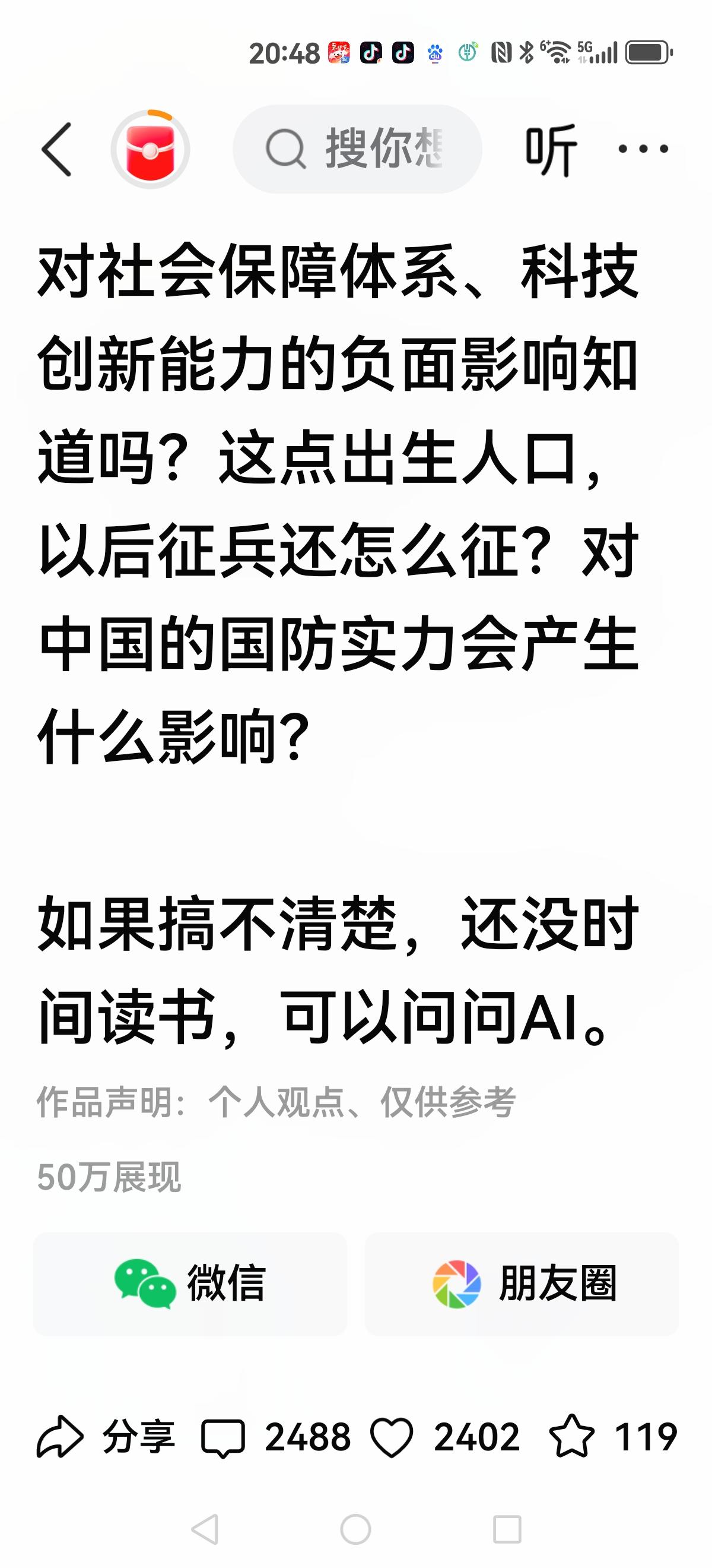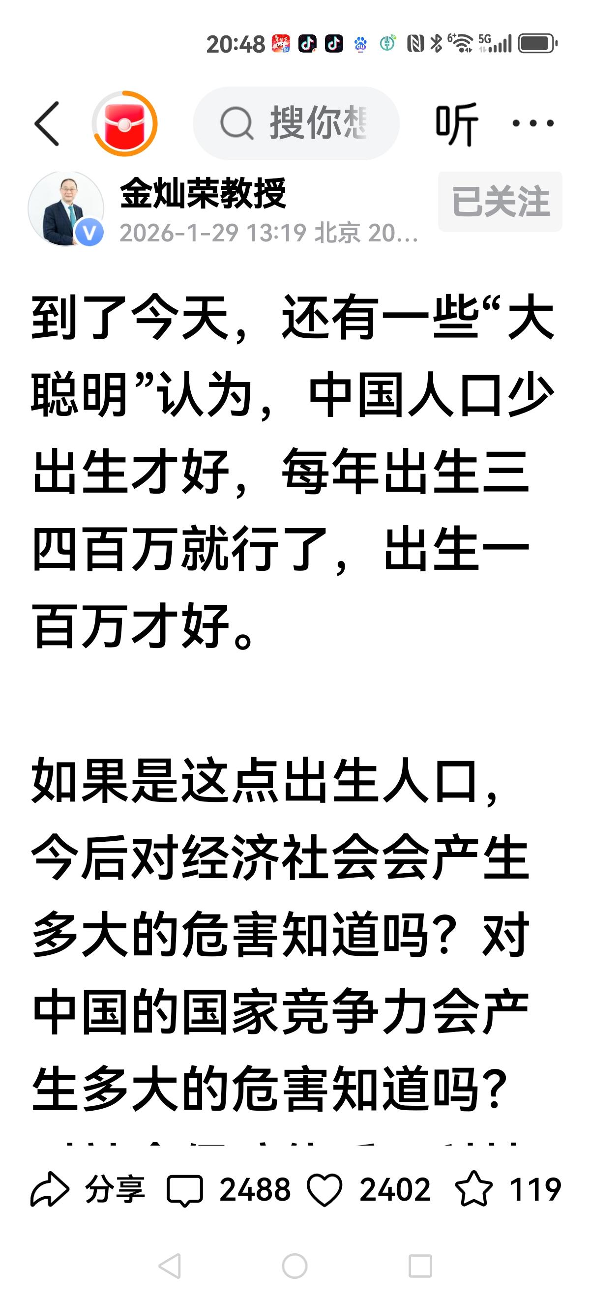 【金灿荣人口论太可怕】 面对人口问题。发生激烈的争论,有人认为每年出生率在三四百万就可以,甚至有人提出一百万即可。 金灿荣指出这种人都是“大聪明”,没有学问最起码问问AI。 金灿荣担心人口出生率降低,对国民经济影响,对国家竞争力也会影响,更重要是征兵?国防实力会受影响。 万万没想到金灿荣担心人口出生率降低怕征不到兵?难道生孩子就是为了当兵吗? 不是享受生活,潇洒走一回,而是去当兵吗?保卫是重要,但不能作为……?