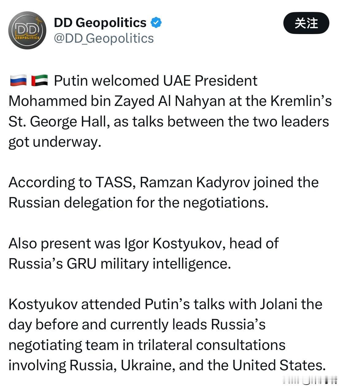最新消息,普京在克里姆林宫圣乔治大厅欢迎阿联酋总统穆罕默德·本·扎耶德·阿勒纳哈扬,两位领导人之间的会谈随即展开。 据塔斯社报道,俄罗斯车臣共和国领导人拉姆赞·卡德罗夫加入了俄罗斯谈判代表团。 俄罗斯军事情报总局局长伊戈尔·科斯秋科夫也出席了会议。 科斯秋科夫前一天参加了普京与约拉尼的会谈,目前领导俄罗斯谈判团队参与俄罗斯、乌克兰和美国之间的三方磋商。
