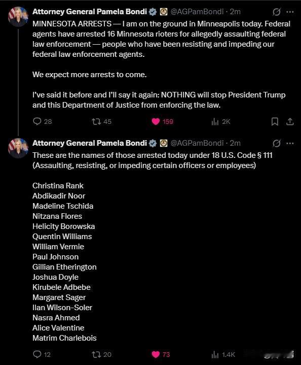 美国司法部长帕姆·邦迪表示,她已“亲临”明尼阿波利斯,并宣布逮捕了至少 16 名被控袭击联邦执法人员的人员。