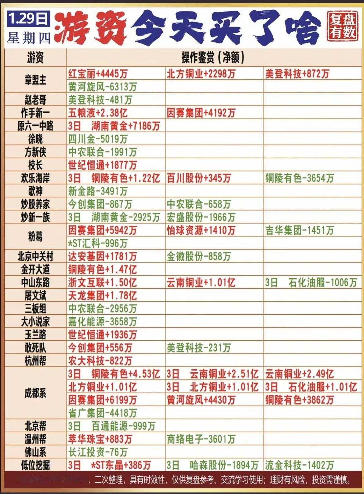 1月29日,周四A股游资买卖排行榜!!! 方新侠卖出中农联合1991万;炒股养家卖出中农联合658万、今创集团867万;成都系3日买入云南铜业2.51亿、北方铜业1.01亿、因赛集团6199万、黄河旋风4430万!!!