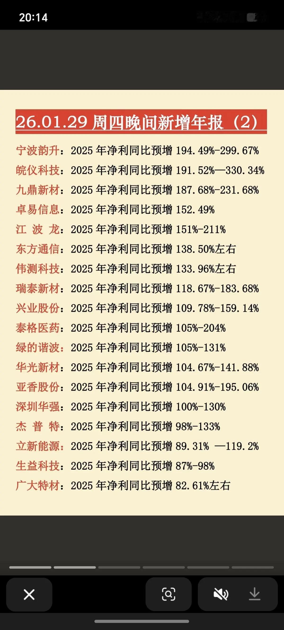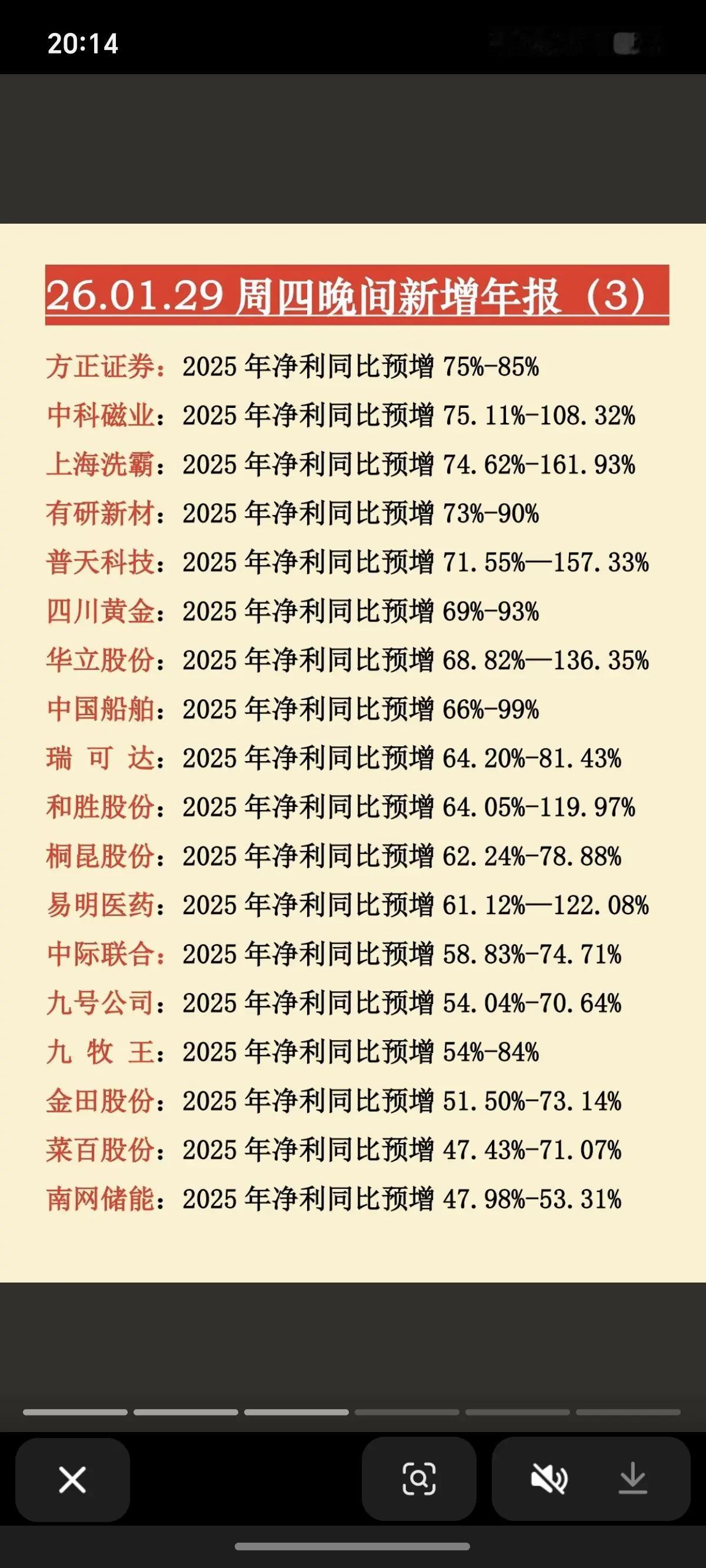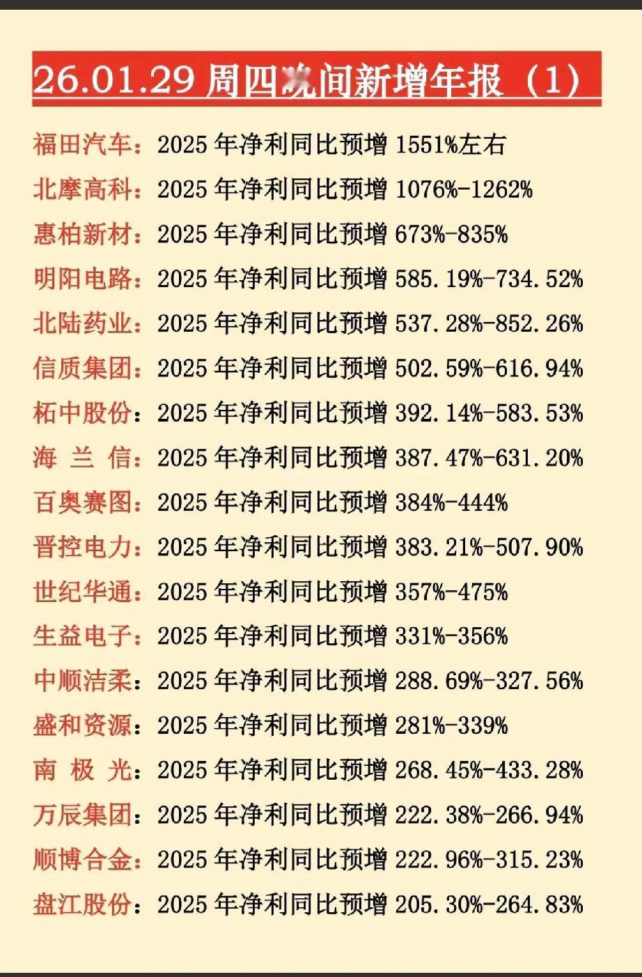 1月29日,周四晚间新增年报大全!!! 北摩高科2025净利同比预增1076-1262%,后市值得高看一眼;福田汽车2025年净利同比预增1551%,后市值得期待;惠柏新材2025年净利同比增长673-835%,后市值得重点关注!!!