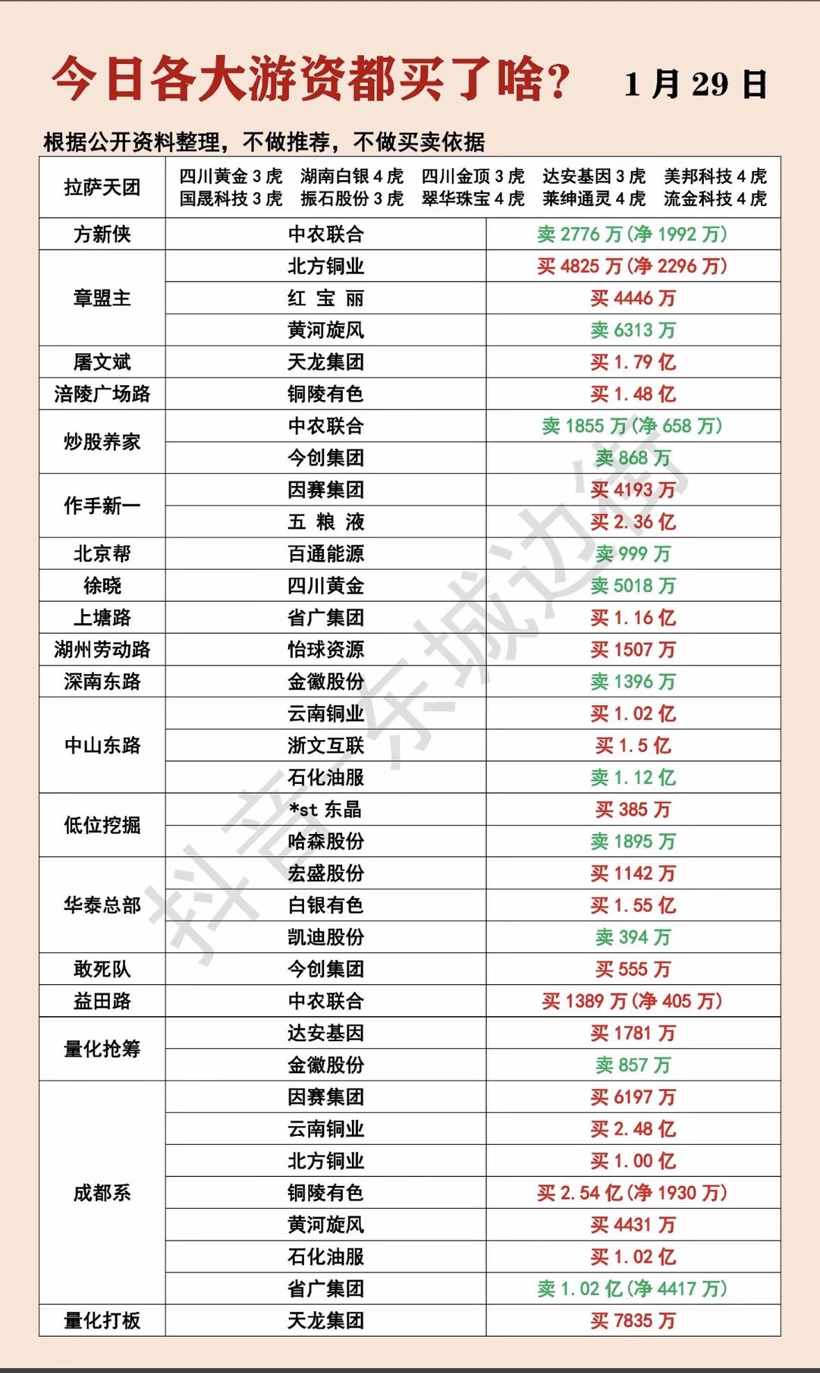 1月29日各大游资买入卖出情况一览! 游资动向:铜业有色受捧,五粮液大买,量化活跃,部分个股遭抛售。