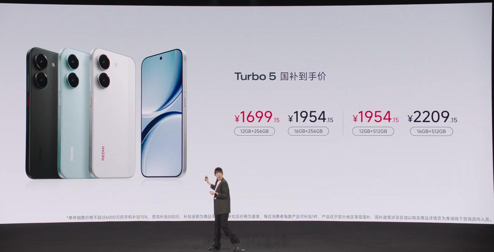 REDMI Turbo 5 正式发布:12+256GB 售价 1999 元(国补后 1699.15)、16+256GB 售价 2299 元(国补后 1954.15)、12+512GB 售价 2299 元(国补后 1954.15)、16GB+512GB 售价 2599 元(国补后 2209.15),还是 Max 香。- 芯片:联发科天玑 8500-Ultra 移动处理平台,LPDDR5X Ultra 内存,UFS 4.1 闪存,5300mm² 双阶凸台 LHP 冰封循环冷泵,狂暴引擎;- 屏幕:6.59 英寸 2756×1268 柔性 OLED 直屏,M10 发光材料,手动最高亮度 800nit、全屏激发 2000nit、25% APL 局部激发 3500nit,支持 120Hz 刷新率,480Hz 触控采样率(2560Hz 瞬时触控采样),3840Hz 高频 PWM 调光+类 DC 调光,12bit 色深,支持 HDR 10+、湿手触控;- 相机:前置 20MP(豪威 OV20B,1/4"),后置 50MP 主摄(索尼 LYT-600,1/1.95",OIS)+8MP 超广角(思特威 SC821CS,1/4");- 续航:7560mAh 小米金沙江电池(硅含量 16%,能量密度 877Wh/L),支持 100W 快充,27W 反向有线充电,支持旁路充电,搭载小米澎湃 G1 电池管理芯片,电池增压芯片,小米澎湃 P3 快充芯片;- 其他:厚 8.18mm,重 204g,祥云白、暗影黑、浅海青 3 款配色,金属中框,2.5D 玻璃后盖,0809 X 轴线性马达,1014D + 1115 双扬声器,支持 NFC、红外遥控,IP66 & IP68 & IP69 & IP69K 防尘防水,Wi-Fi 6,蓝牙 6.0,三频北斗+双频 GPS,光学屏幕指纹,搭载澎湃 OS 3 系统。