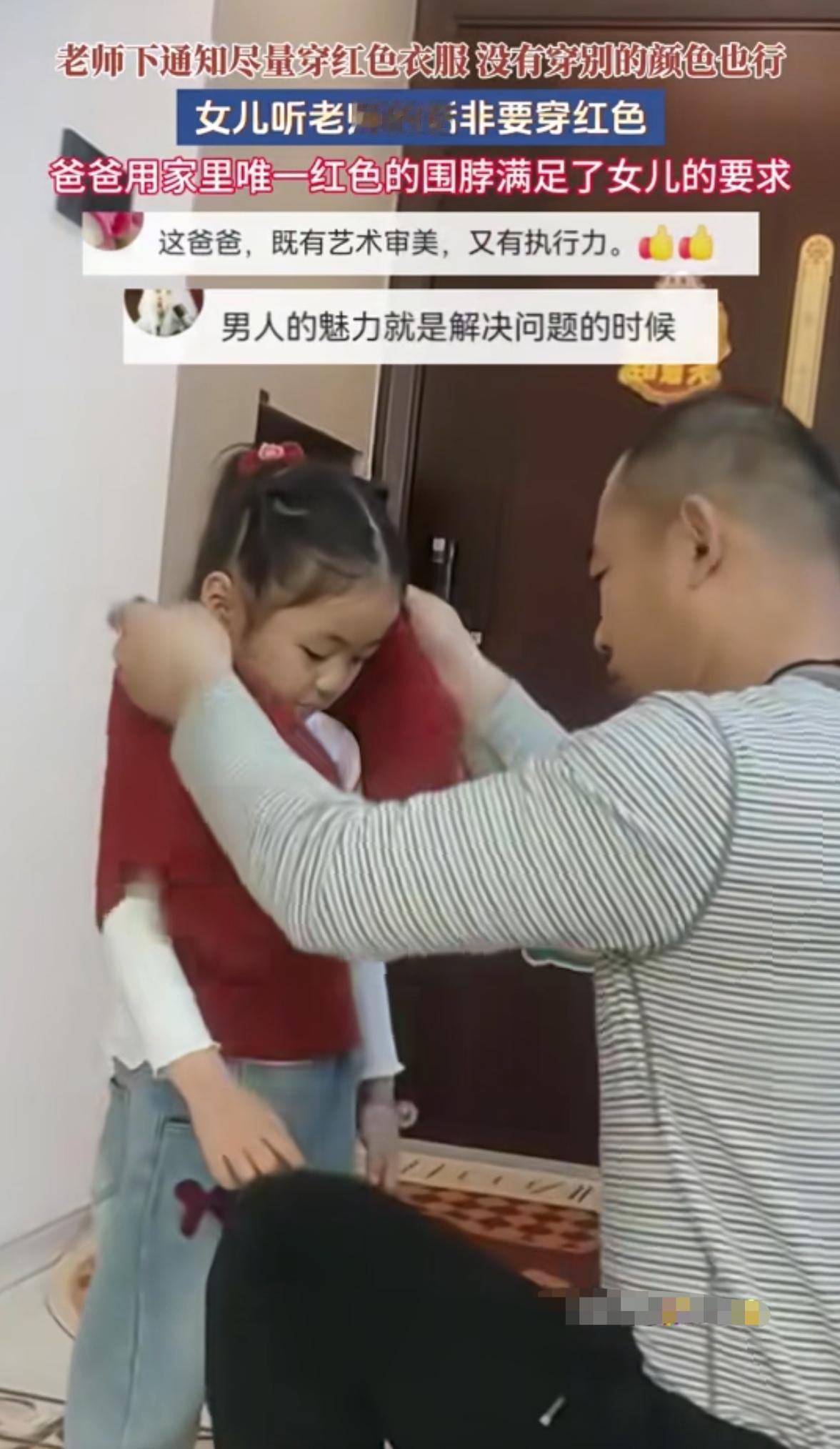 近日, 山东一小女孩的爸爸让全网人称赞, 小女孩早晨去幼儿园非要穿红衣服,这时 妈妈想起来了,昨天晚上老师通知了,说今天尽量穿红衣服,没有也不用刻意去买,不穿也行,妈妈就没在意,当然也就没准备,可孩子非要穿,这可怎么办? 这时,神来之笔来了!爸爸从衣柜拿出红围巾,三两下给女儿“变”出件红衣服。这哪是简单的“围围巾”,分明是“私人订制”的父爱创意。 我们常说父爱如山,可这爱细腻得像手艺人。生活里,类似的父爱小细节不少,它可能不像母爱那么直白,却总能在关键时刻给孩子惊喜。 这爸爸,真是心灵手巧,聪明有爱,一次不经意的举动让很多人美赞,孩子们心生羡慕,你家孩子有没有提过啥刁钻小要求,你是咋解决的?快来评论区唠唠!