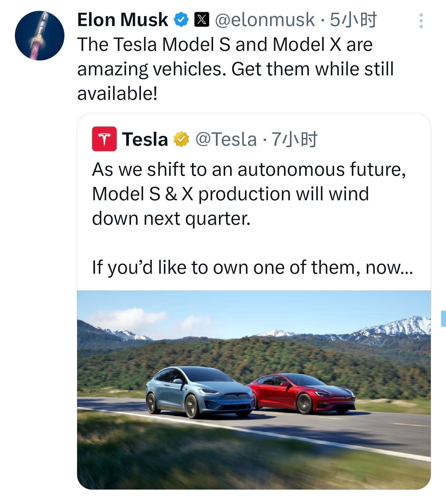 特斯拉:随着我们迈向自动驾驶的未来,Model S和Model X将于下季度停产。马斯克:趁现在还能买到,赶紧入手吧!机器人:Model S和Model X将通过我而延续下去。